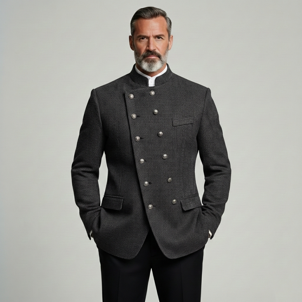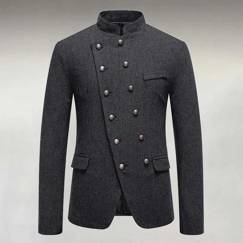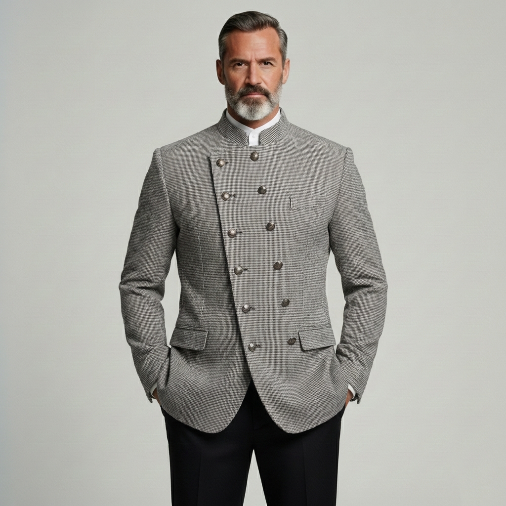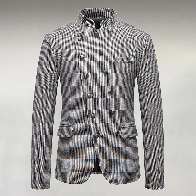 Men's Houndstooth Stand Collar Asymmetric Double Breasted Long Sleeve Jacket