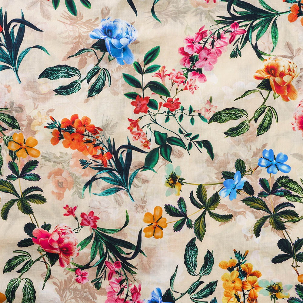 Inspired by the lush abundance of a summer garden, this design captures the harmonious blend of nature's rhythms and colors. Featuring a variety of vibrant flowers symbolizing vitality and hope, the clever interplay of colors creates a visually rich effect, as if flower petals are dancing in the breeze, expressing the joy of life. The soft beige background resembles the gentle light of the sun, highlighting the vividness of the flowers and enhancing the overall depth and translucency. This design not only adds an artistic and stylish touch to the garment but also envelops the wearer in the warm embrace of nature, bringing a poetic and refined essence to everyday life.