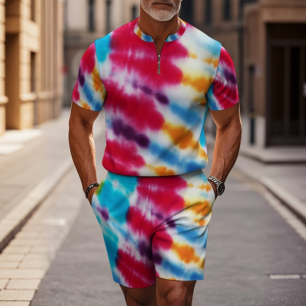 Men's fashion casual round-neck zipper geometric printed short-sleeved two-piece set 2504000207