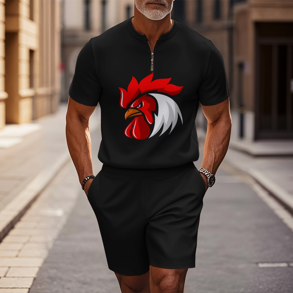 Men's fashion casual round-neck zipper geometric printed short-sleeved two-piece set 2505000014