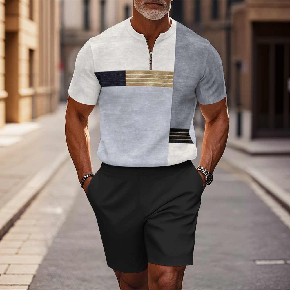 Men's fashion casual round-neck zipper geometric printed short-sleeved two-piece set 2505000481