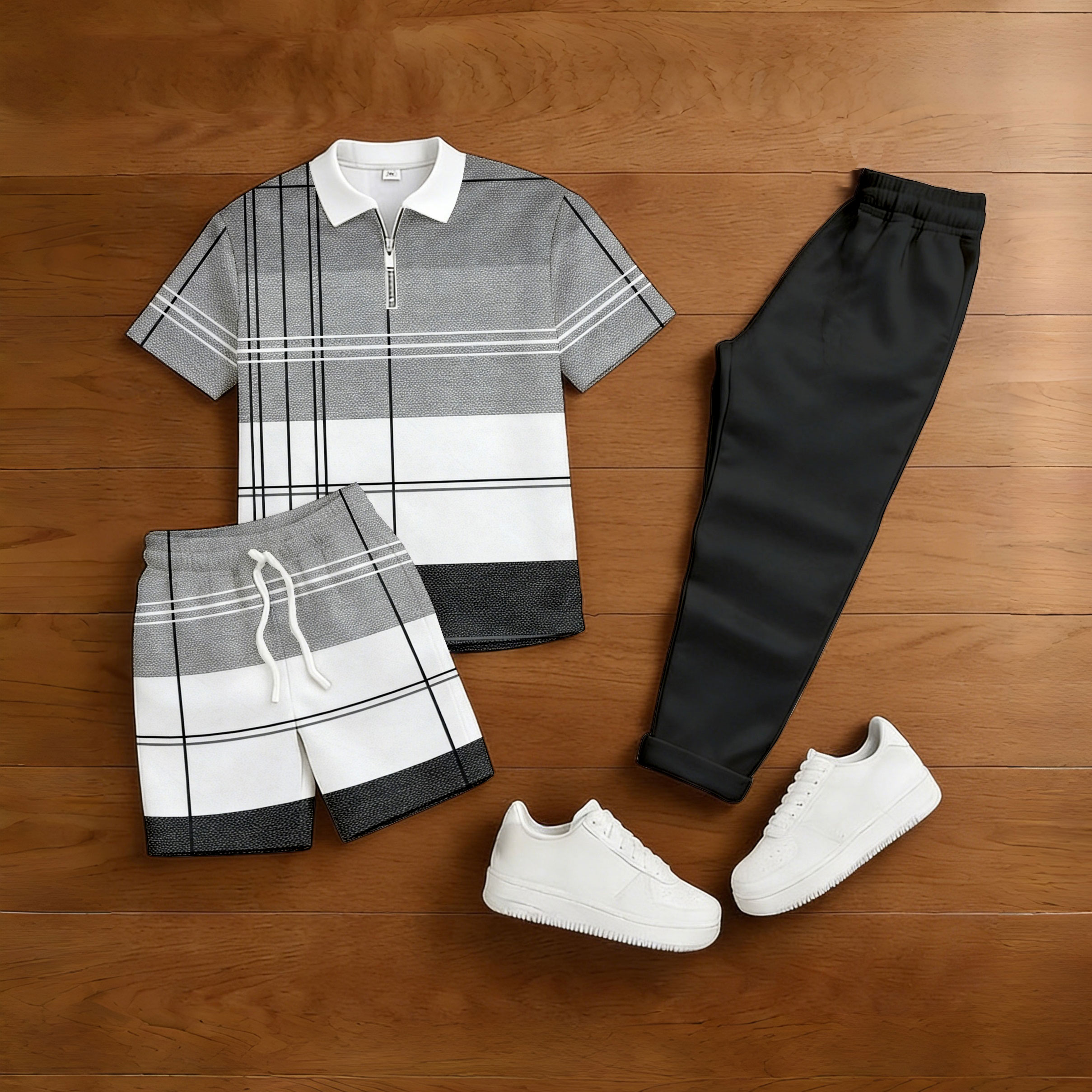 Men's Casual Black & Gray & White Color Matching Checkered Printed Zipper Short Sleeved Polo Shirt & Trousers & Shorts 3Pc Set