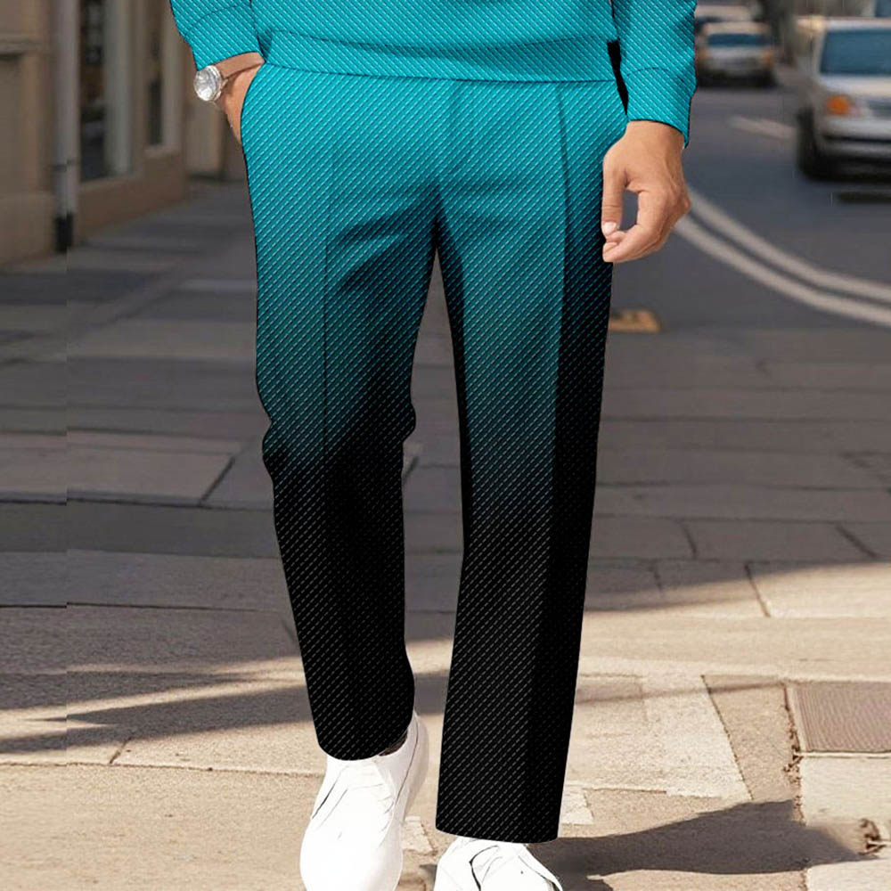 Men's Casual Black & Green Color Matching Gradient Printed Polo-Collar Zipper Long Sleeved Trousers Two-Piece Set