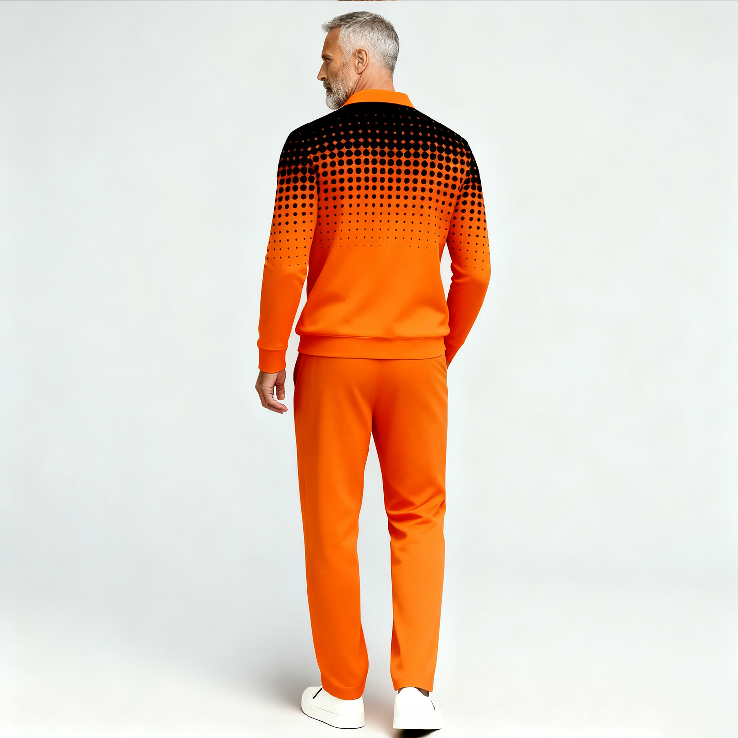 Men's Casual Black&Orange Polka Dots Color Matching Printed Polo-Collar Zipper Long Sleeved Trousers Two-Piece Set