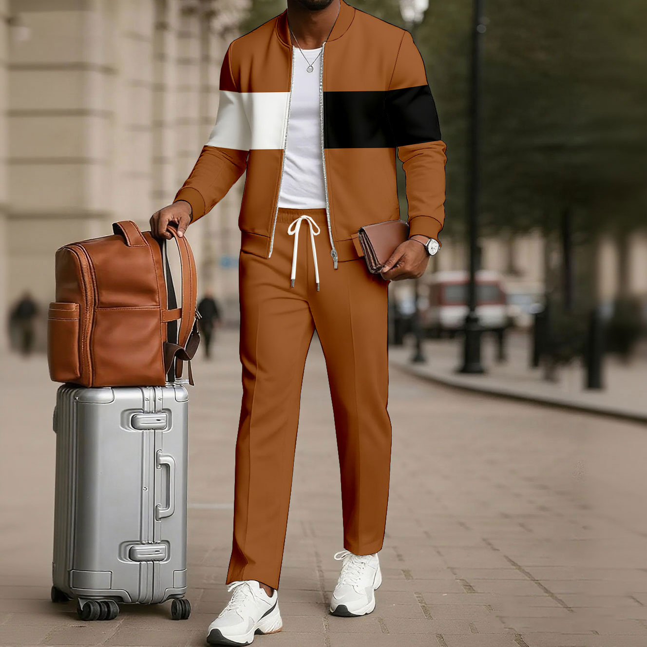 Men's Casual Black & White Color Matching Striped Printed Round Neck Long Sleeved Jacket & Trousers Brown Two-Piece Set