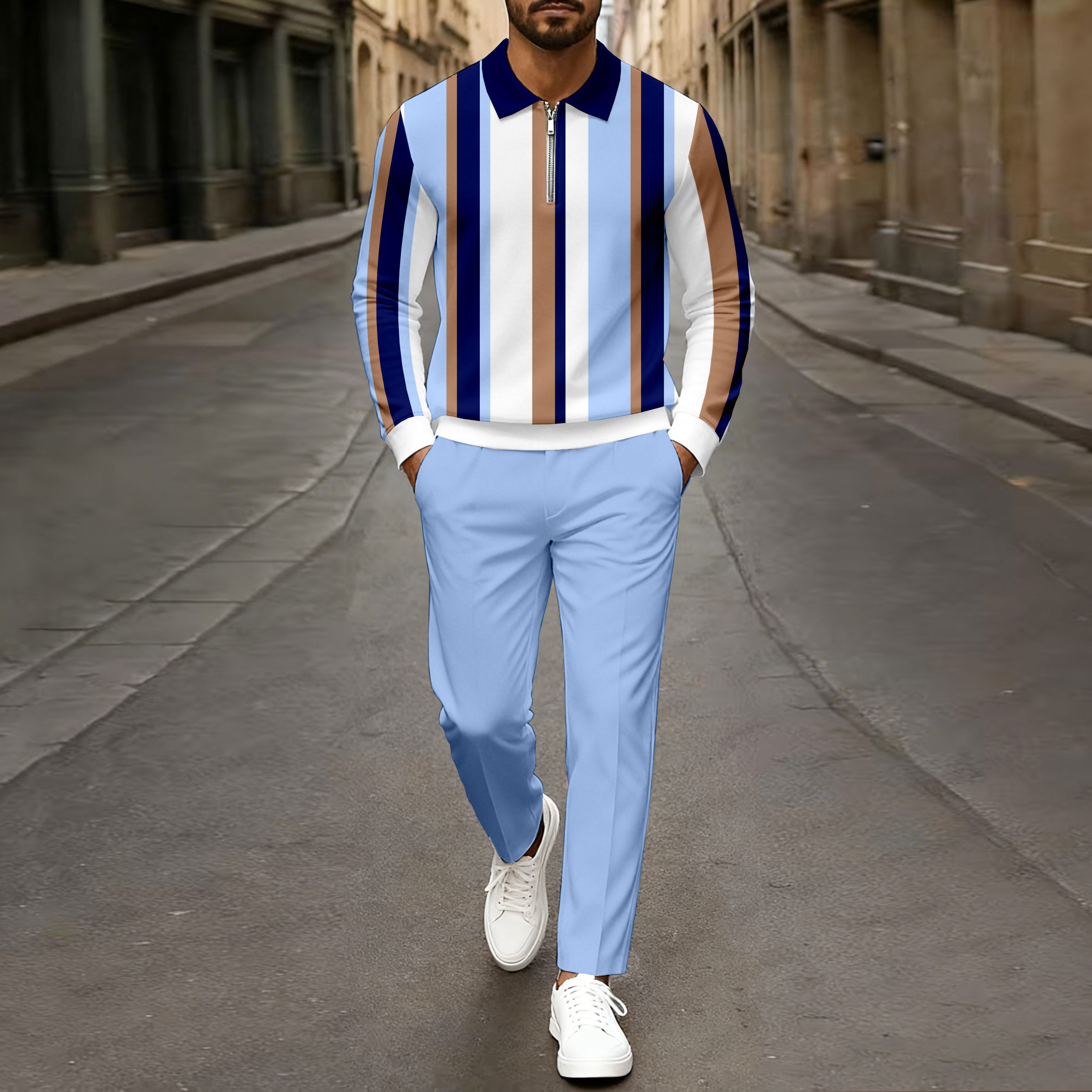 Men's Casual Blue & White Color Matching Striped Printed Polo-Collar Zipper Long Sleeved Trousers Two-Piece Set
