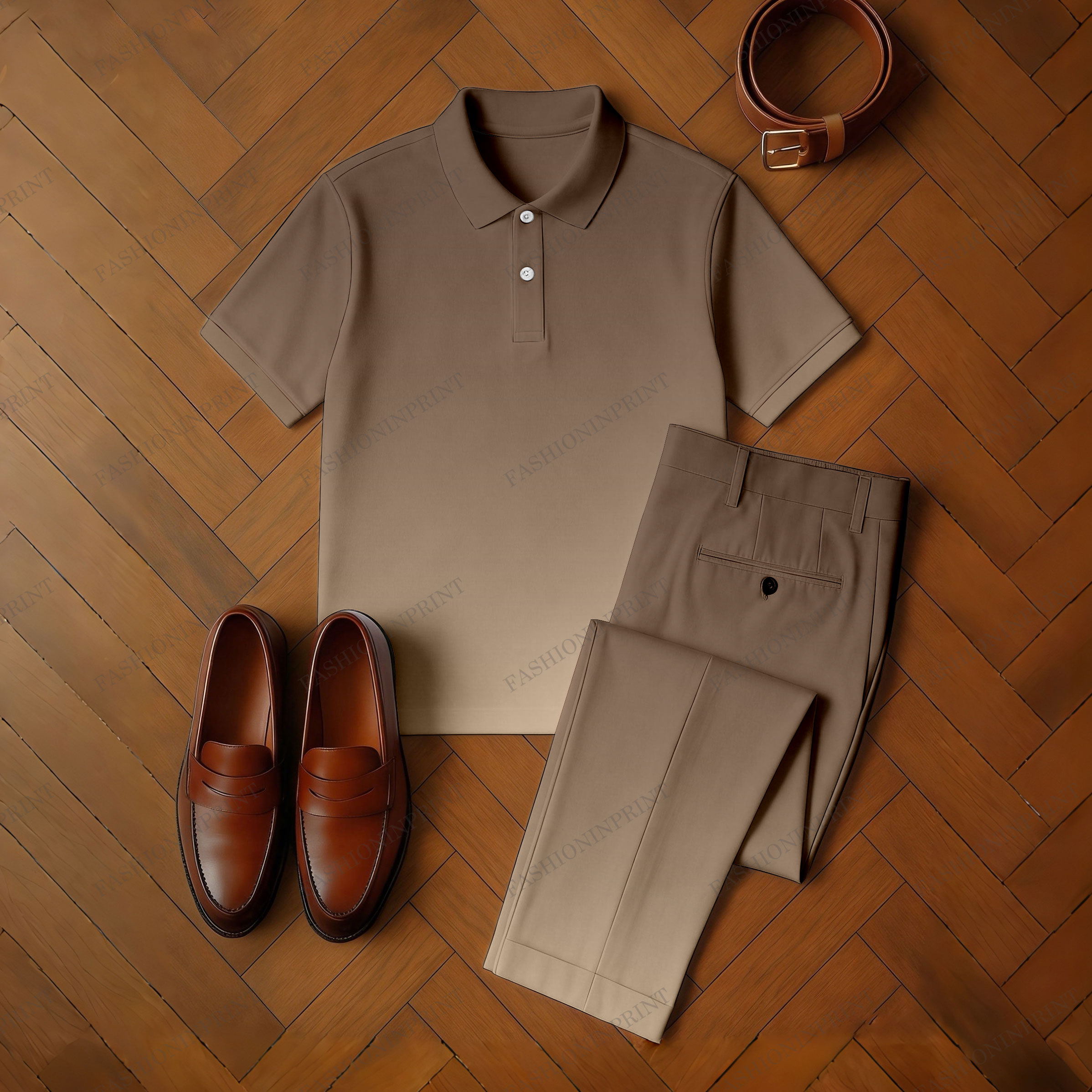 Men's Casual Brown Gradient White Color Matching Printed Short Sleeved Polo Shirt & Trousers Two-Piece Set