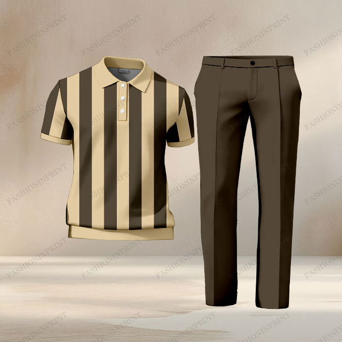 Men's Casual Coffee & Yellow Color Matching Striped Printed Short Sleeved Polo Shirt & Trousers Two-Piece Set