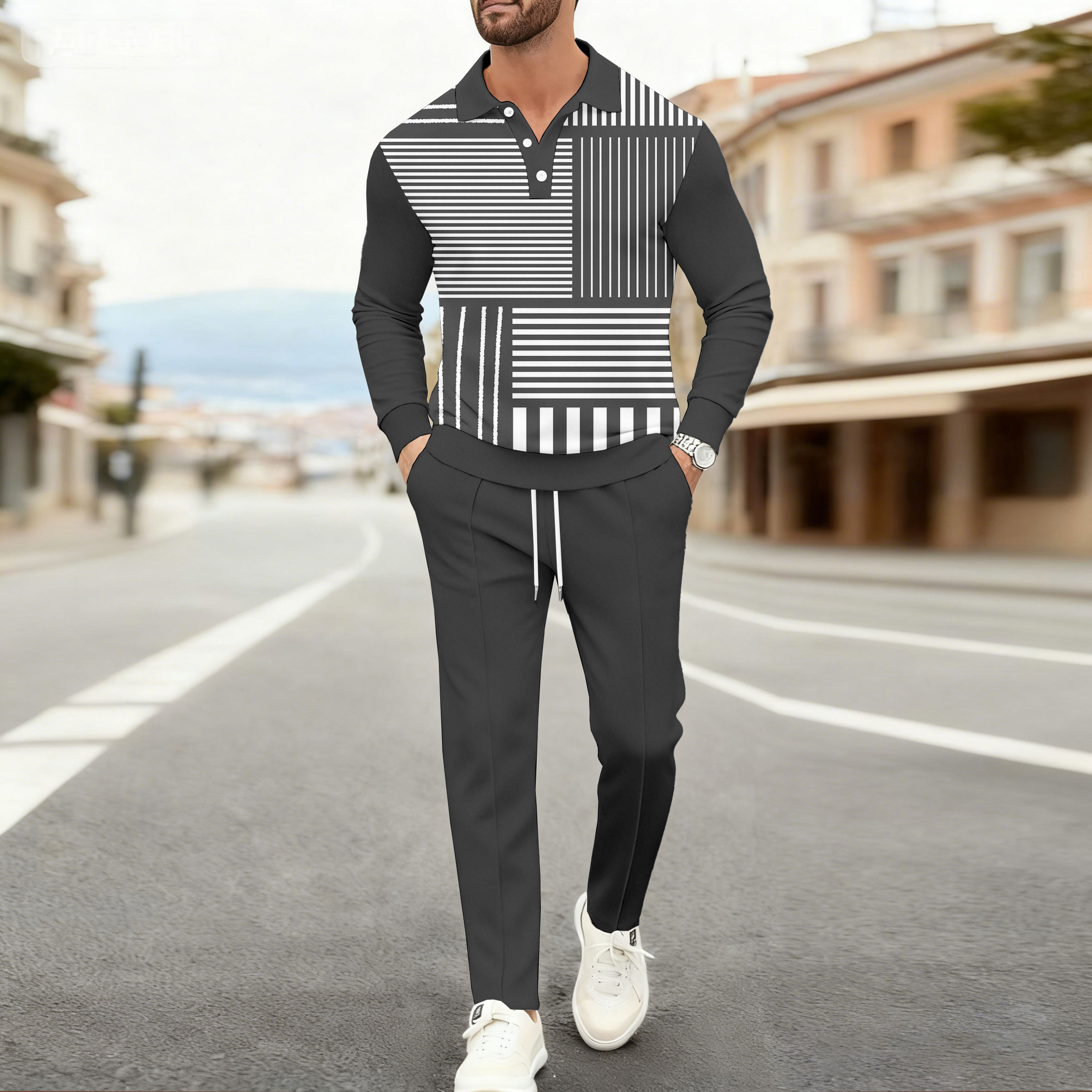 Men's Casual Color Gray & White Matching Striped Printed Polo-Collar Long Sleeved Trousers Two-Piece Set