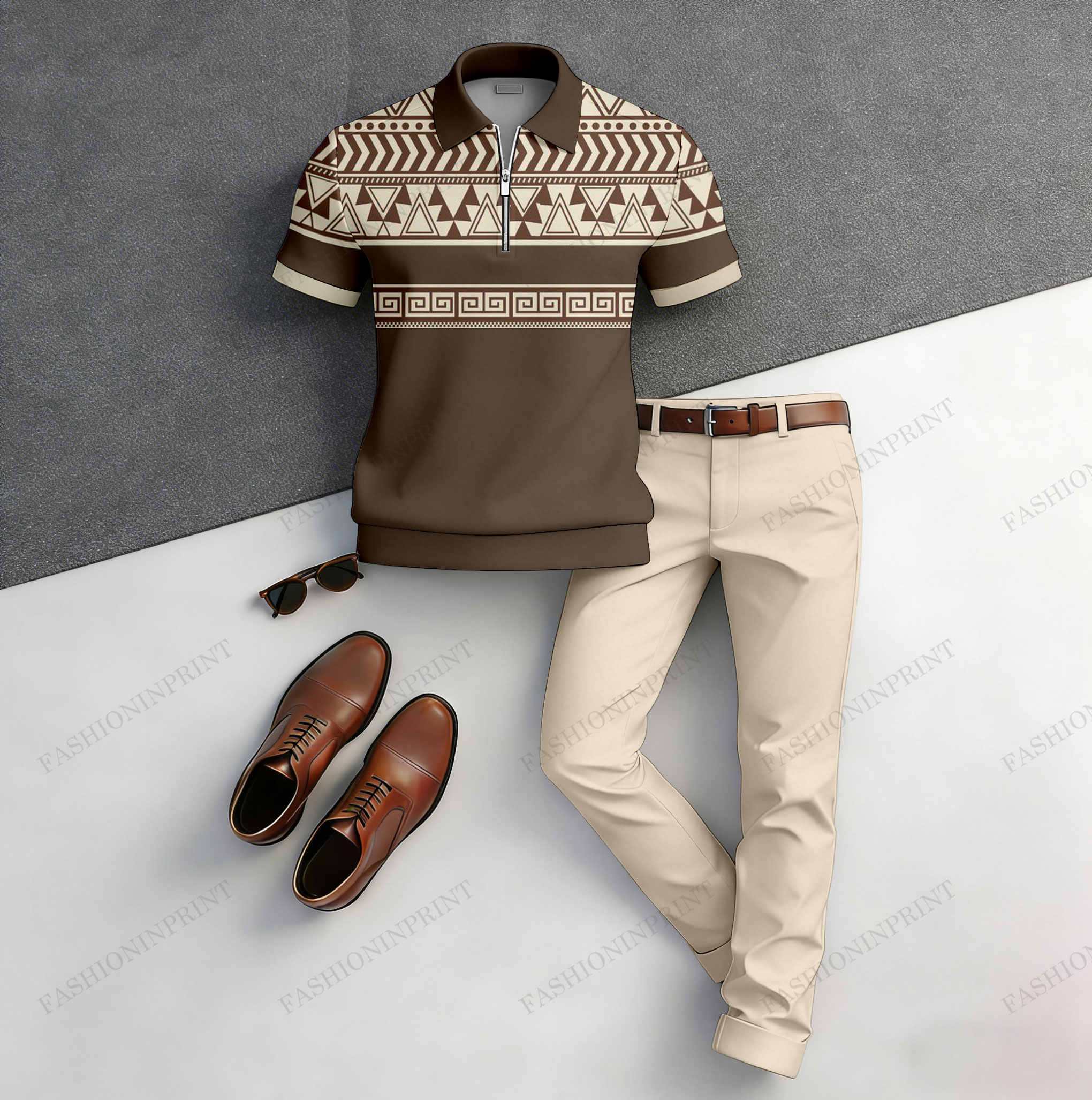 Men's Casual Brown Matching Geometric Printed Short Sleeved Polo Shirt & Trousers Two-Piece Set