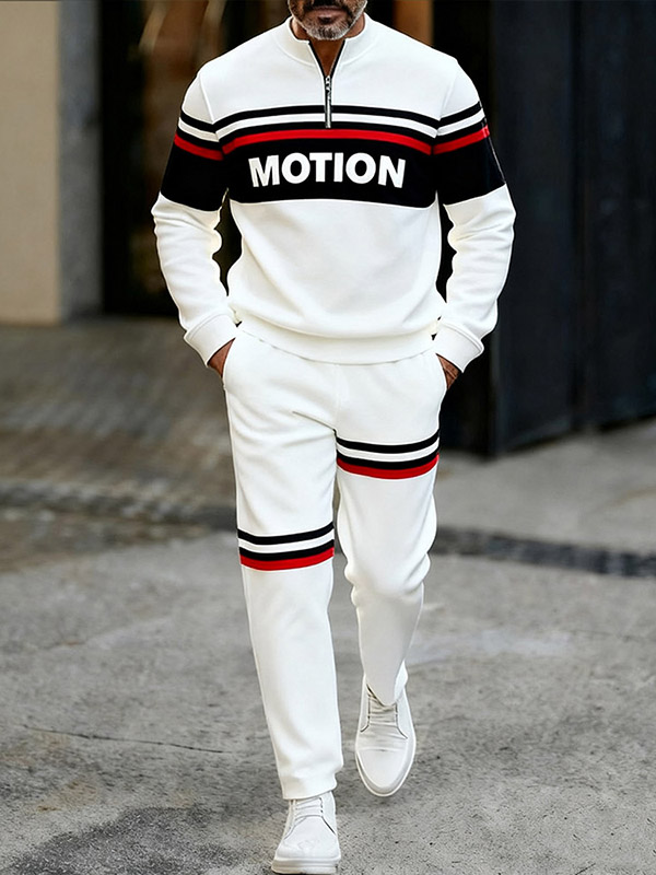 Men's Casual Color Matching Letter Printed Round-Neck Zipper Long Sleeved Trousers White Two-Piece Set