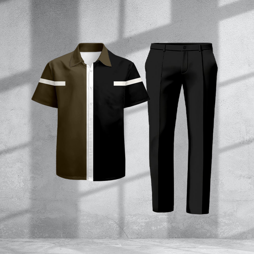 Men's Casual Army Green & Black Color Matching Print Short-Sleeve Shirt & Trousers Two-Piece Set