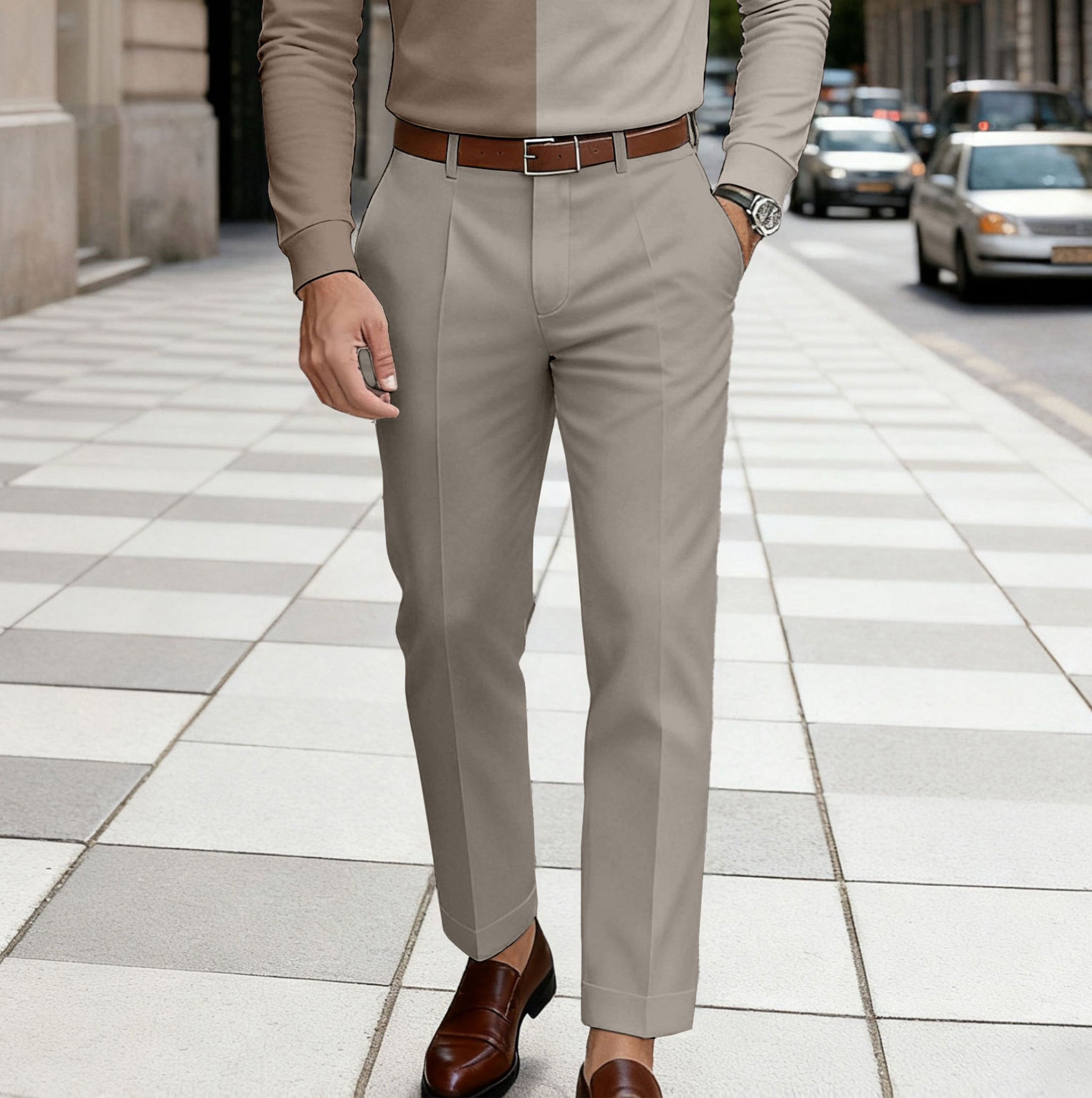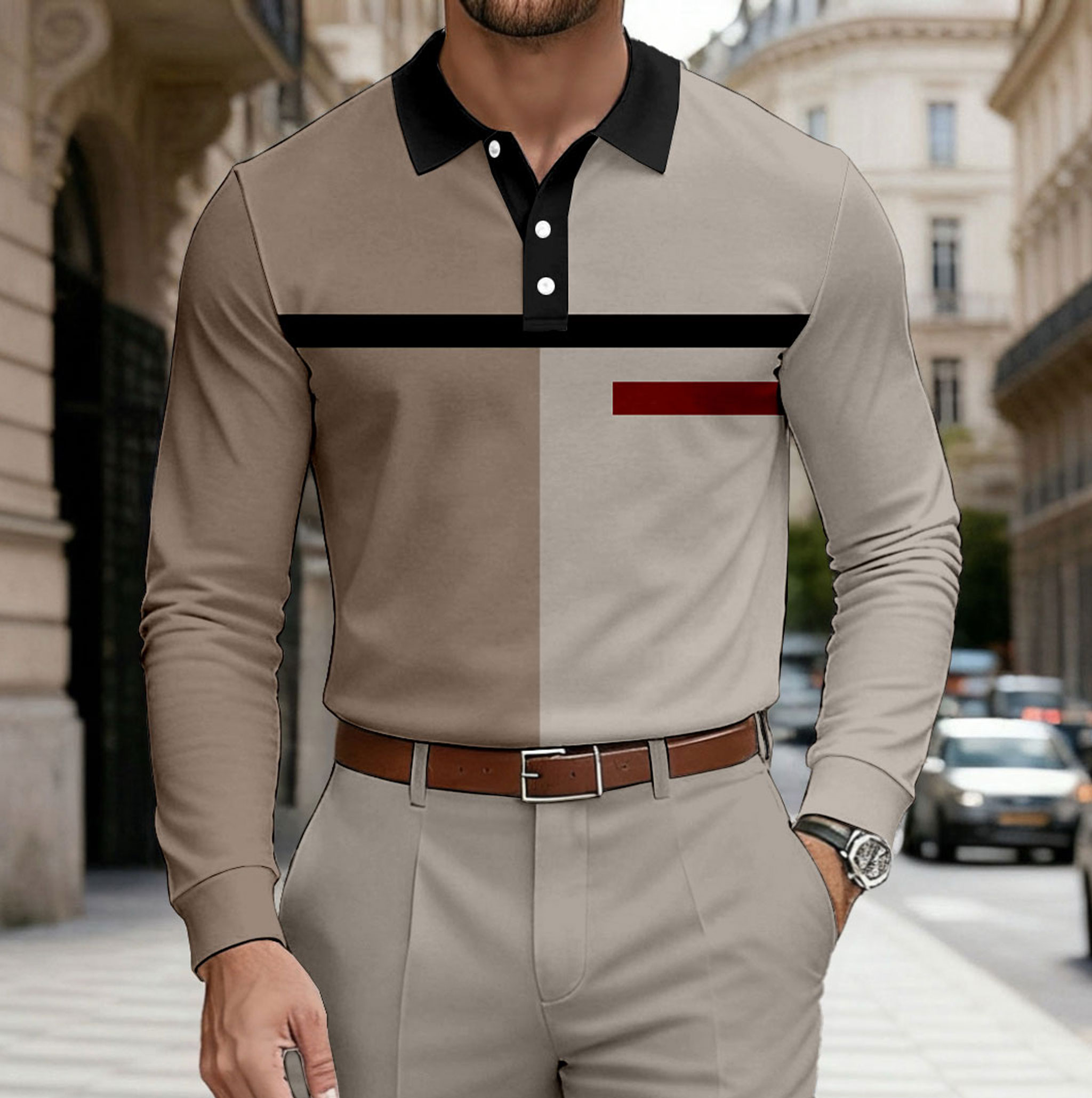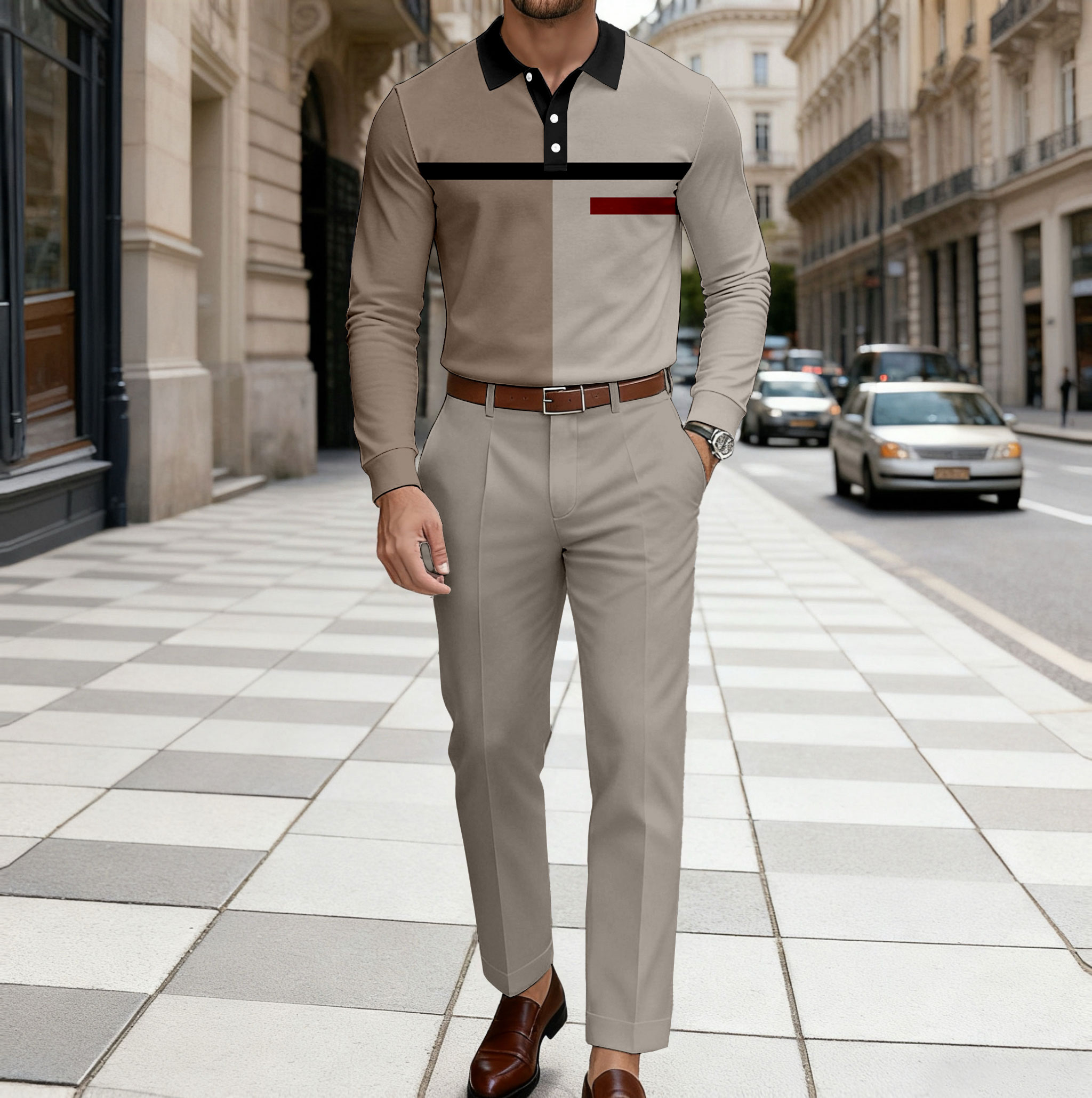 Men's Casual Color Matching Printed Polo-Collar Long Sleeved Trousers Two-Piece Set