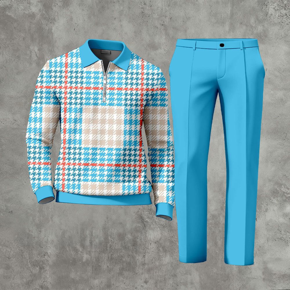 Men's Casual Blue Color Matching Houndstooth Partten Polo-Collar Zipper Long Sleeved Trousers Two-Piece Set