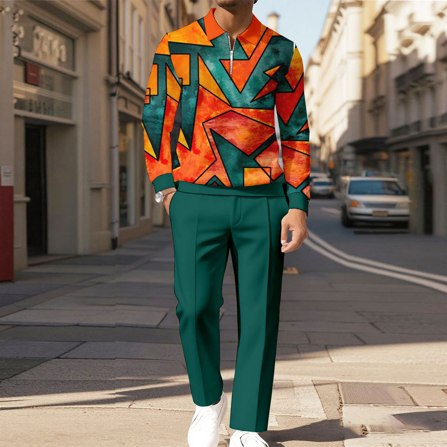 Men's Casual Color Matching Printed Polo-Collar Zipper Long Sleeved Trousers Two-Piece Set