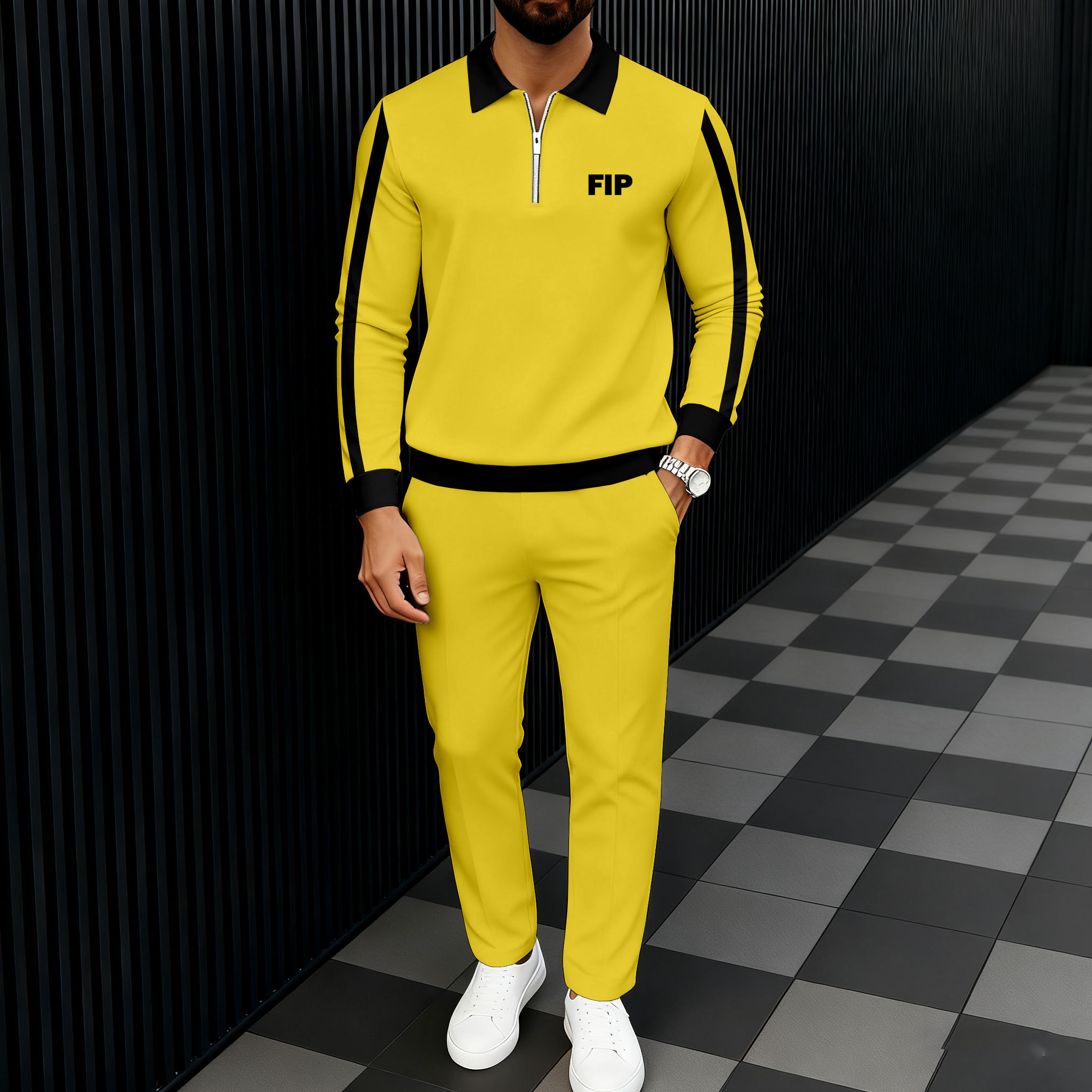 Men's Casual Black Striped Printed Polo-Collar Zipper Long Sleeved Trousers Yellow Two-Piece Set