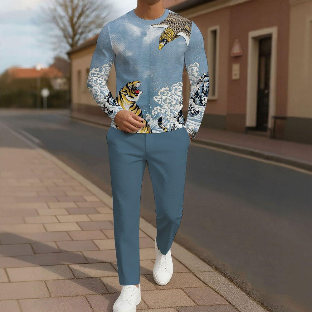 This men's casual two-piece set is the perfect combination of comfort and style, designed for the warmer seasons of spring and summer. Made from a high-quality blend of 100% cotton and polyester, the fabric ensures a soft feel while being breathable and durable for all-day wear. Featuring a bold geometric print, this set offers a unique, modern look that stands out in any casual or sporty setting. The round-neck design and short sleeves provide a relaxed and comfortable fit, ideal for various occasions like casual outings, sports, or weekend get-togethers.