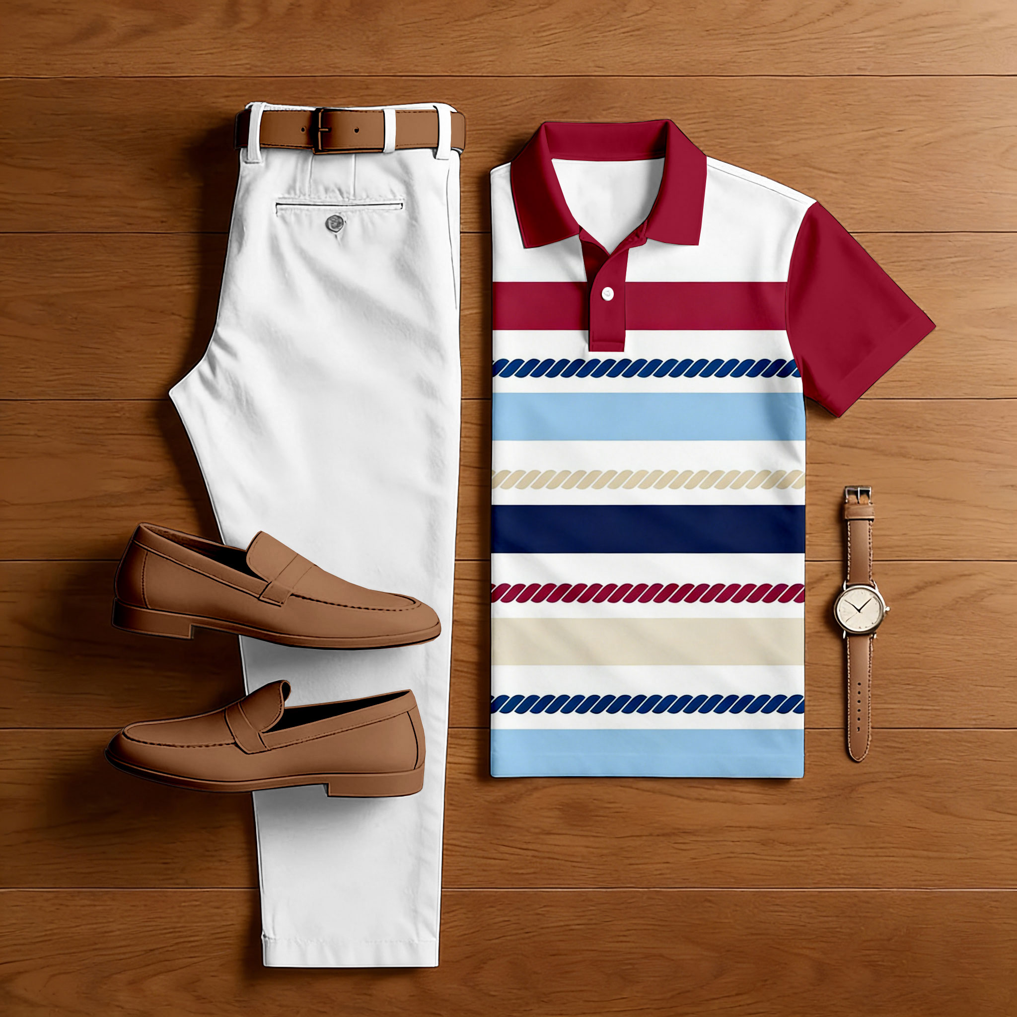 Men's Casual White & Maroon Multi Color Matching Striped Printed Short Sleeved Polo Shirt & Trousers Two-Piece Set