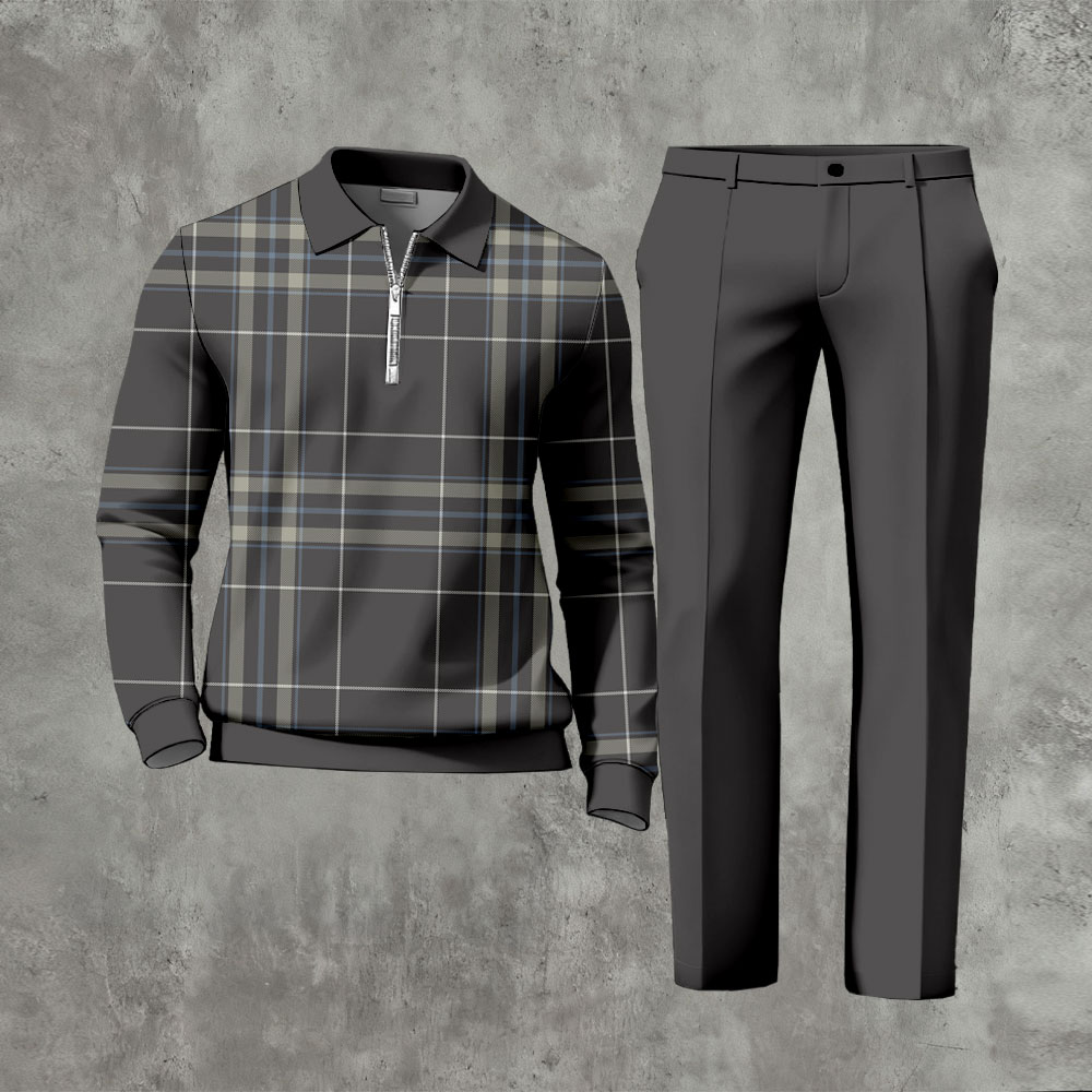 Men's Casual Dark Gray Color Matching Checkered Printed Zipper Long Sleeved Polo Shirt & Trousers Two-Piece Set