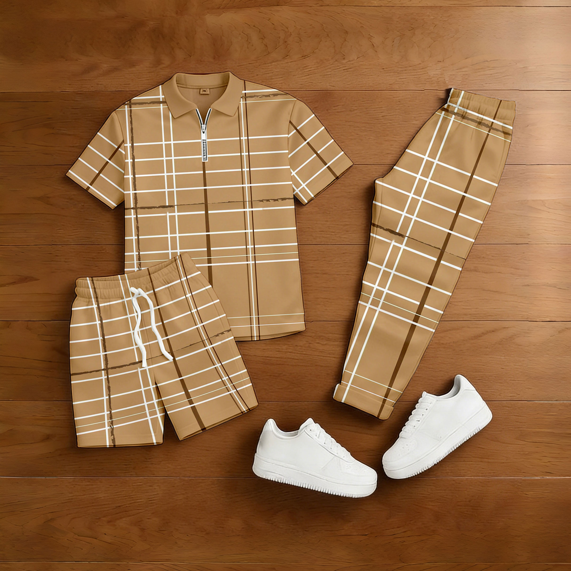 Men's Casual Tan & White Color Matching Geometric Printed Zipper Short Sleeved Polo Shirt & Trousers & Shorts 3Pc Set