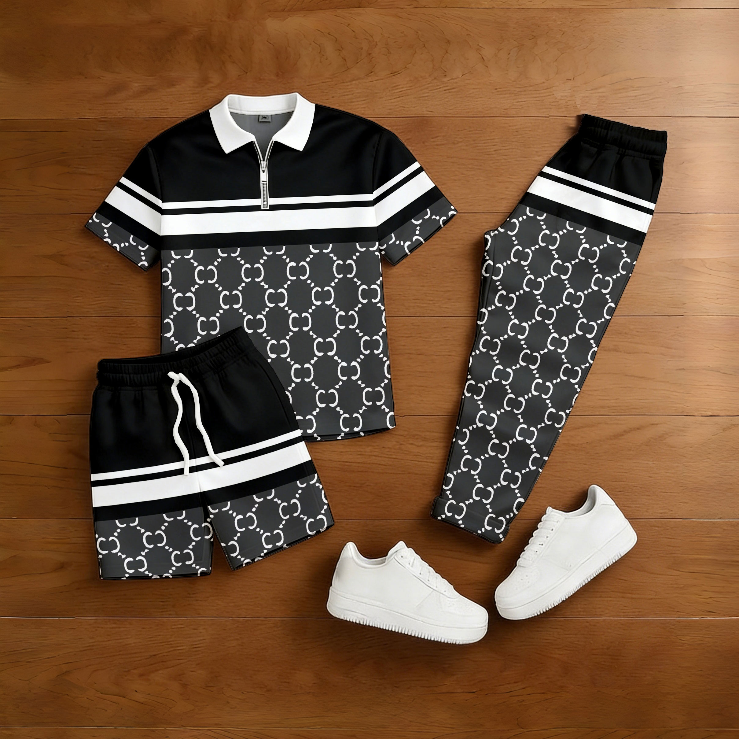 Men's Casual Black & White Color Matching Vintage Printed Zipper Short Sleeved Polo Shirt & Trousers & Shorts 3Pc Set
