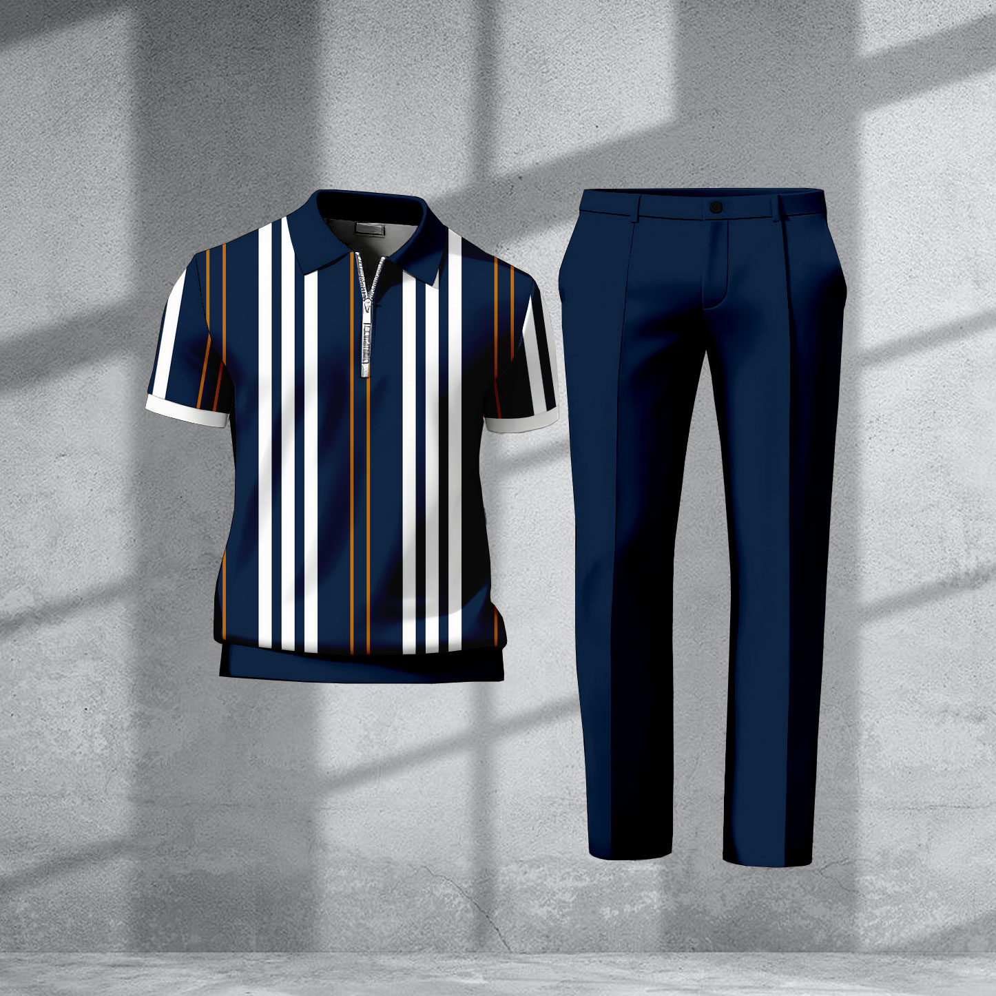 Men's Casual Navy Blue & White Color Matching Striped Printed Zipper Short Sleeved Polo Shirt & Trousers Two-Piece Set