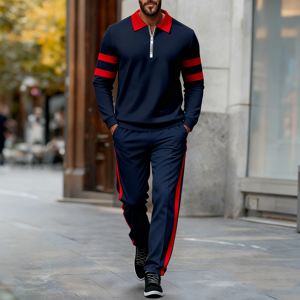 Men's Casual Color Matching Striped Printed Polo-Collar Zipper Long Sleeved Trousers Navy Blue Two-Piece Set