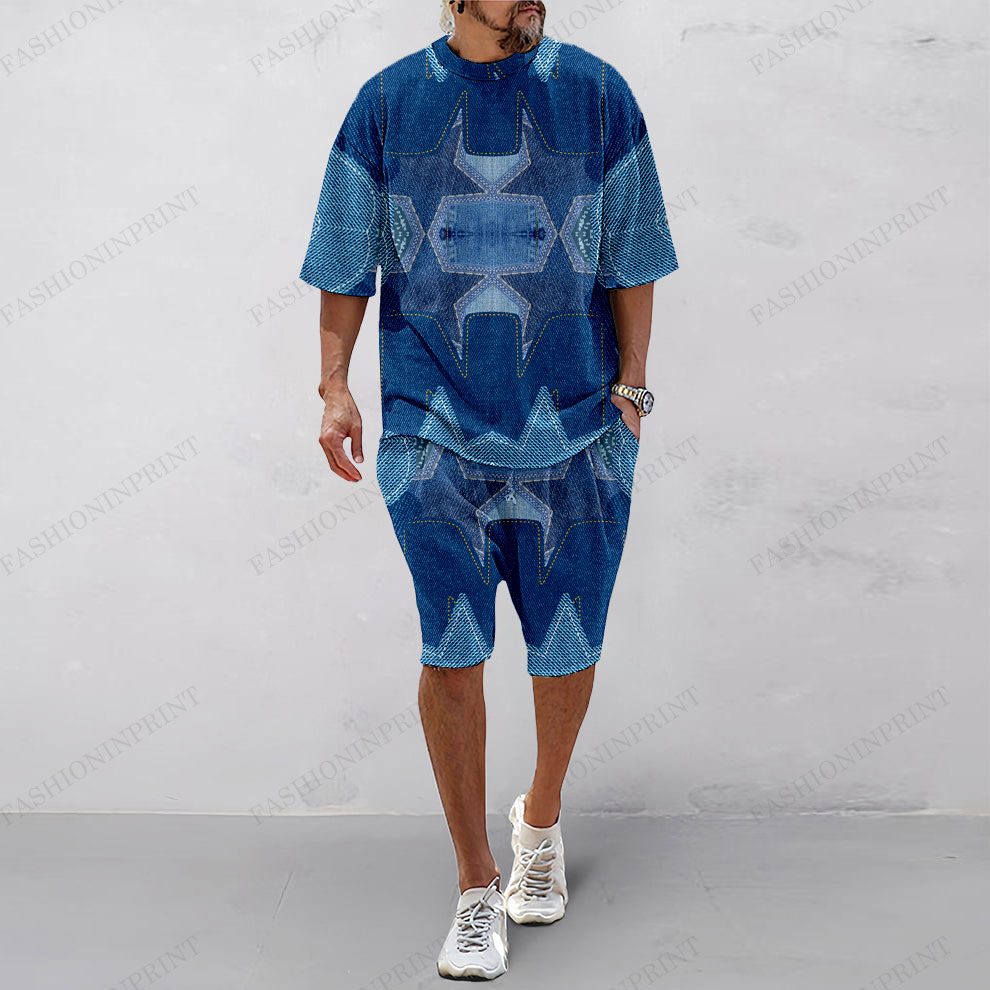 Men's Casual Dark Blue Geometric Printed Crew Neck Button-Up Short-Sleeve T-Shirt And Shorts Two-Piece Set