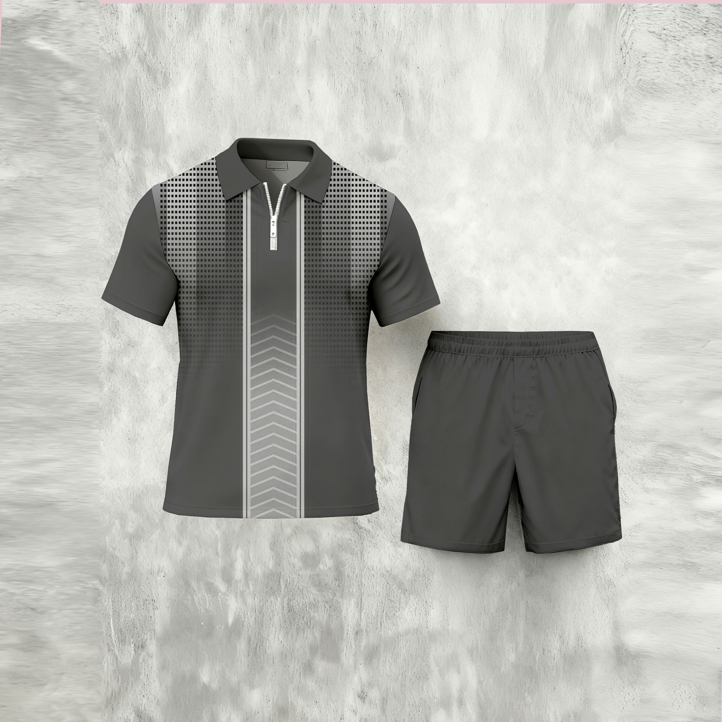 Men's Casual Gray Polka Dots Gradient Colo Print Zipper Short-Sleeve Polo Shirt & Shorts Two-Piece Set