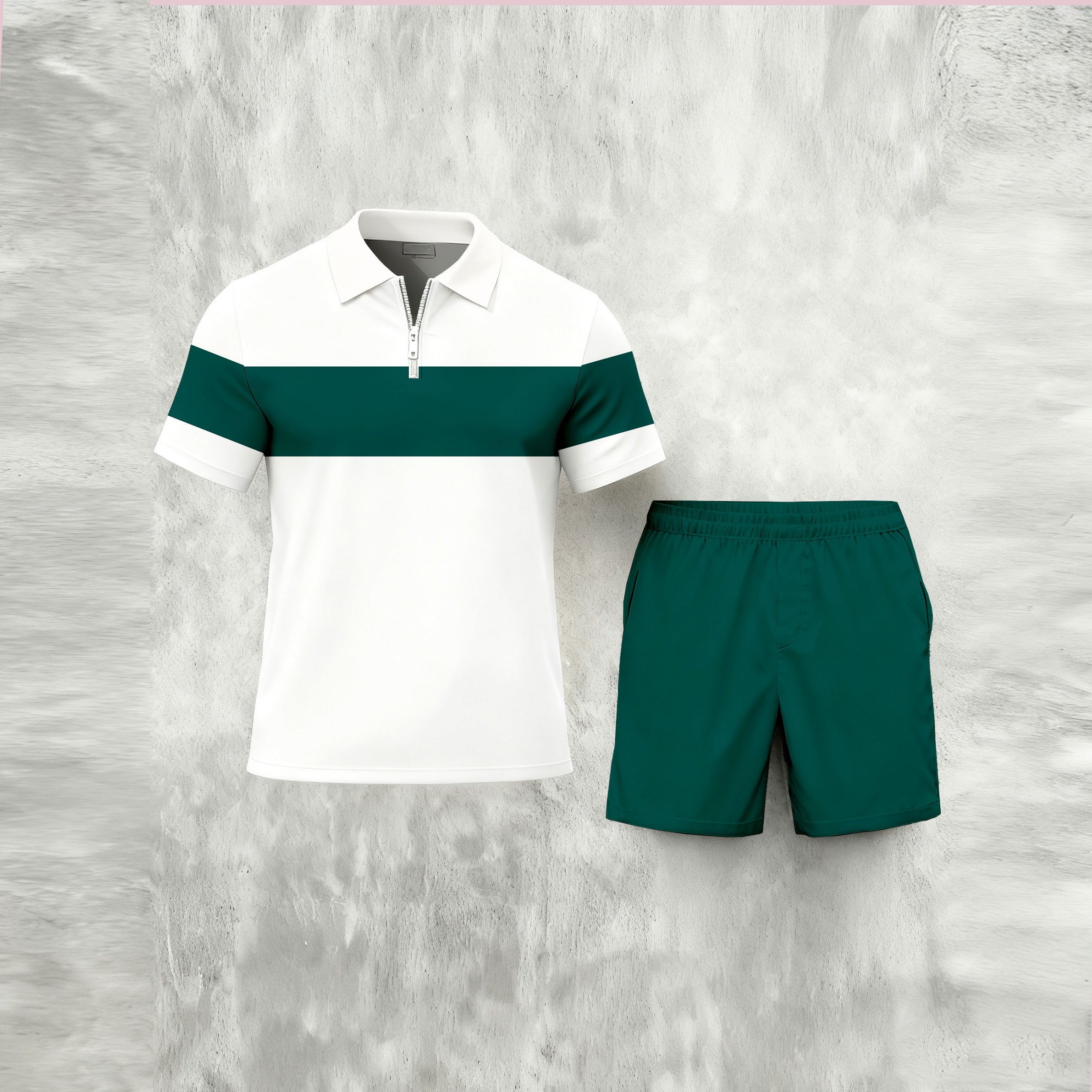 Men's Casual Green & White Color Matching Geometric Print Zipper Short-Sleeve Polo Shirt & Shorts Two-Piece Set