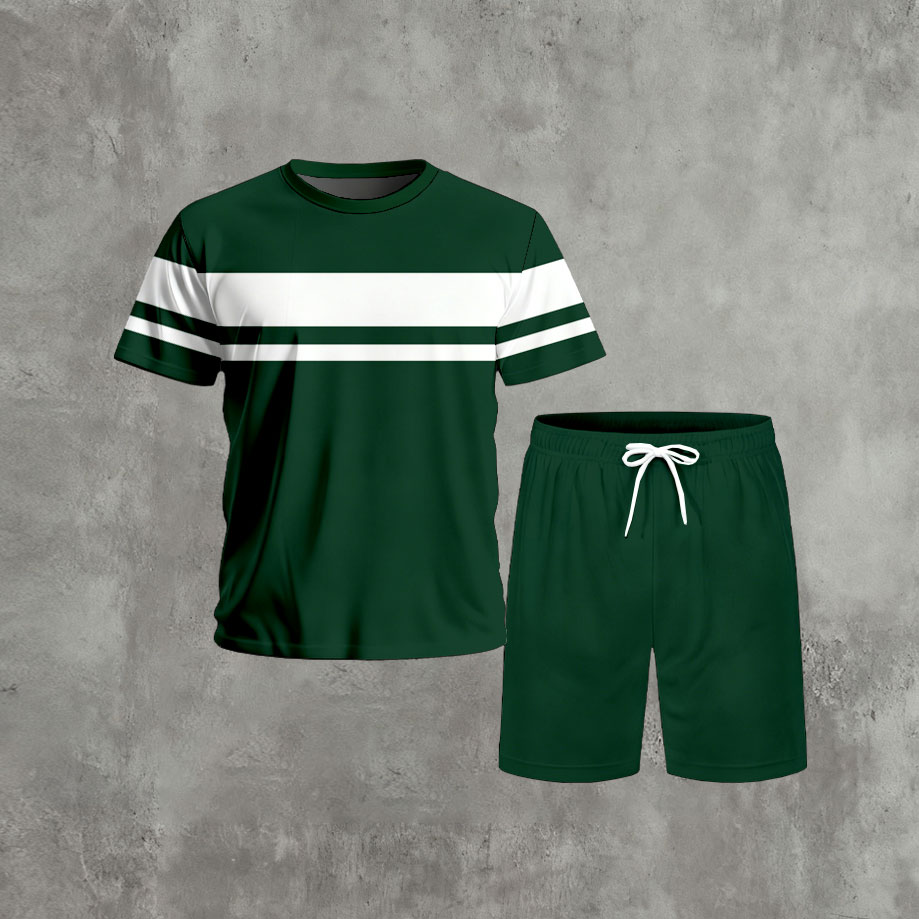 Men's Casual Green & White Color Matching Striped Printed Round Neck Short Sleeved & Shorts Two-Piece Set