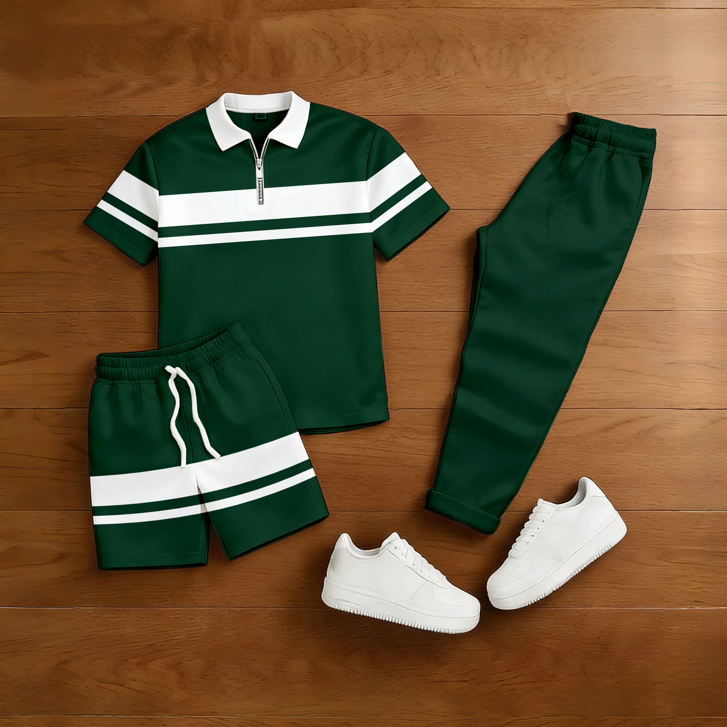 Men's Casual Green & White Color Matching Striped Printed Zipper Short Sleeved Polo Shirt & Trousers & Shorts 3Pc Set