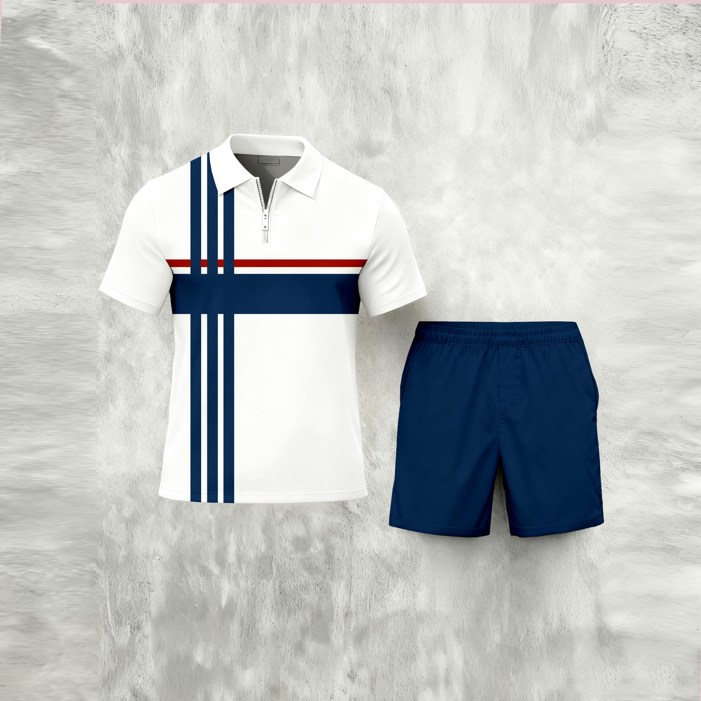 Men's Casual Navy Blue & White Color Matching Geometric Print Zipper Short-Sleeve Polo Shirt & Shorts Two-Piece Set