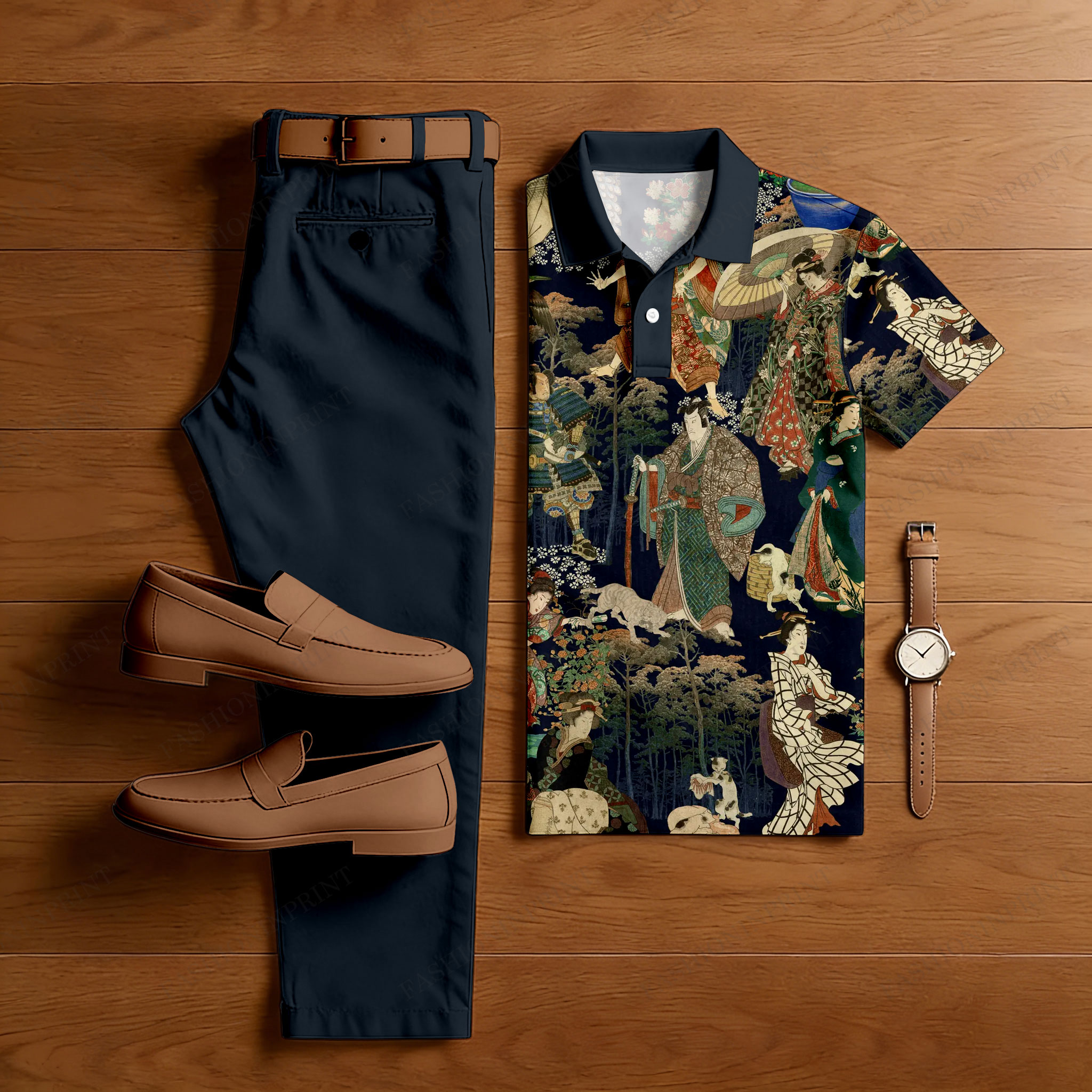 Men's Casual Dark Japanese Style Printed Polo Shirt And Pants Two-Piece Set