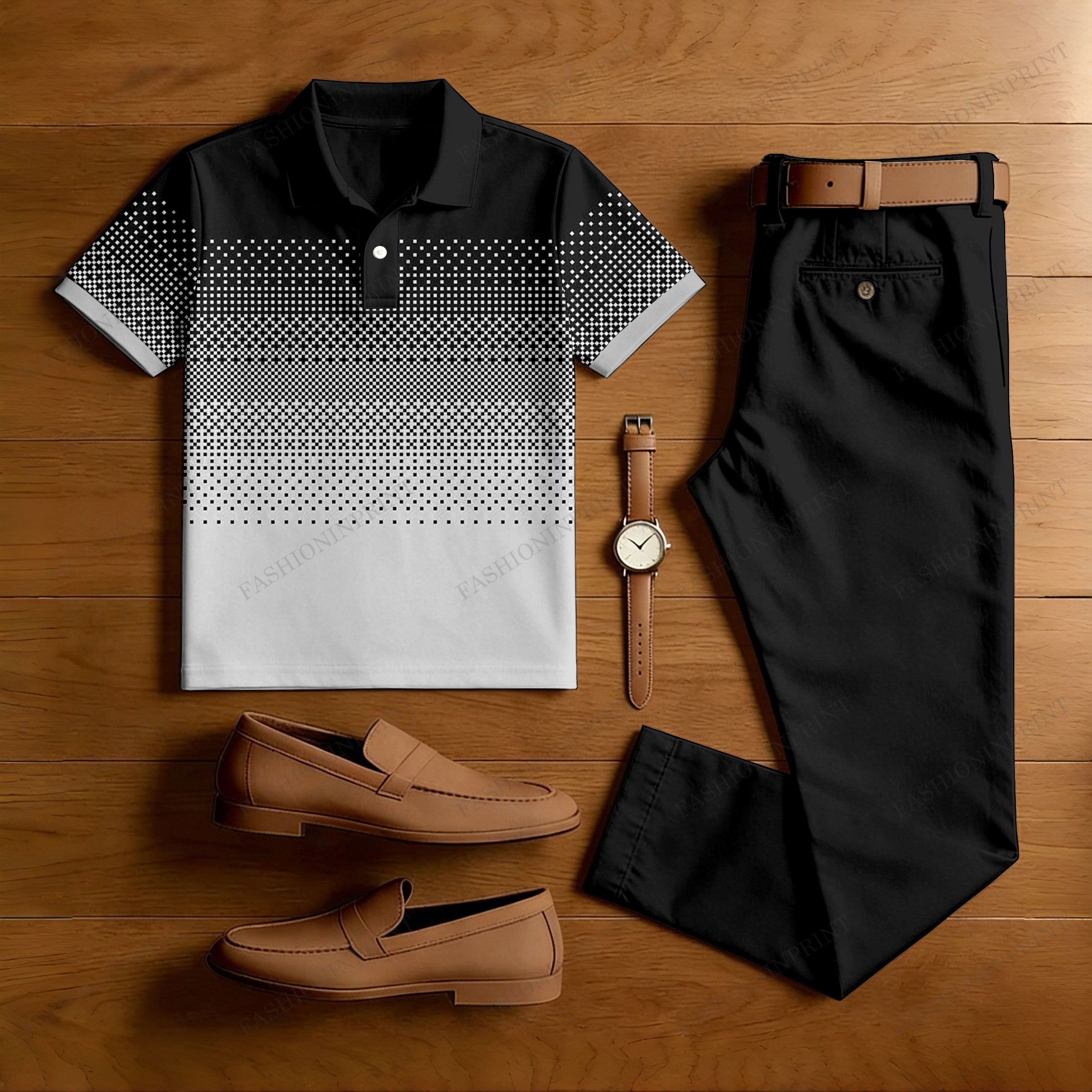 Men's Casual Black Gradient Printed Polo Shirt And Pants Two-Piece Set