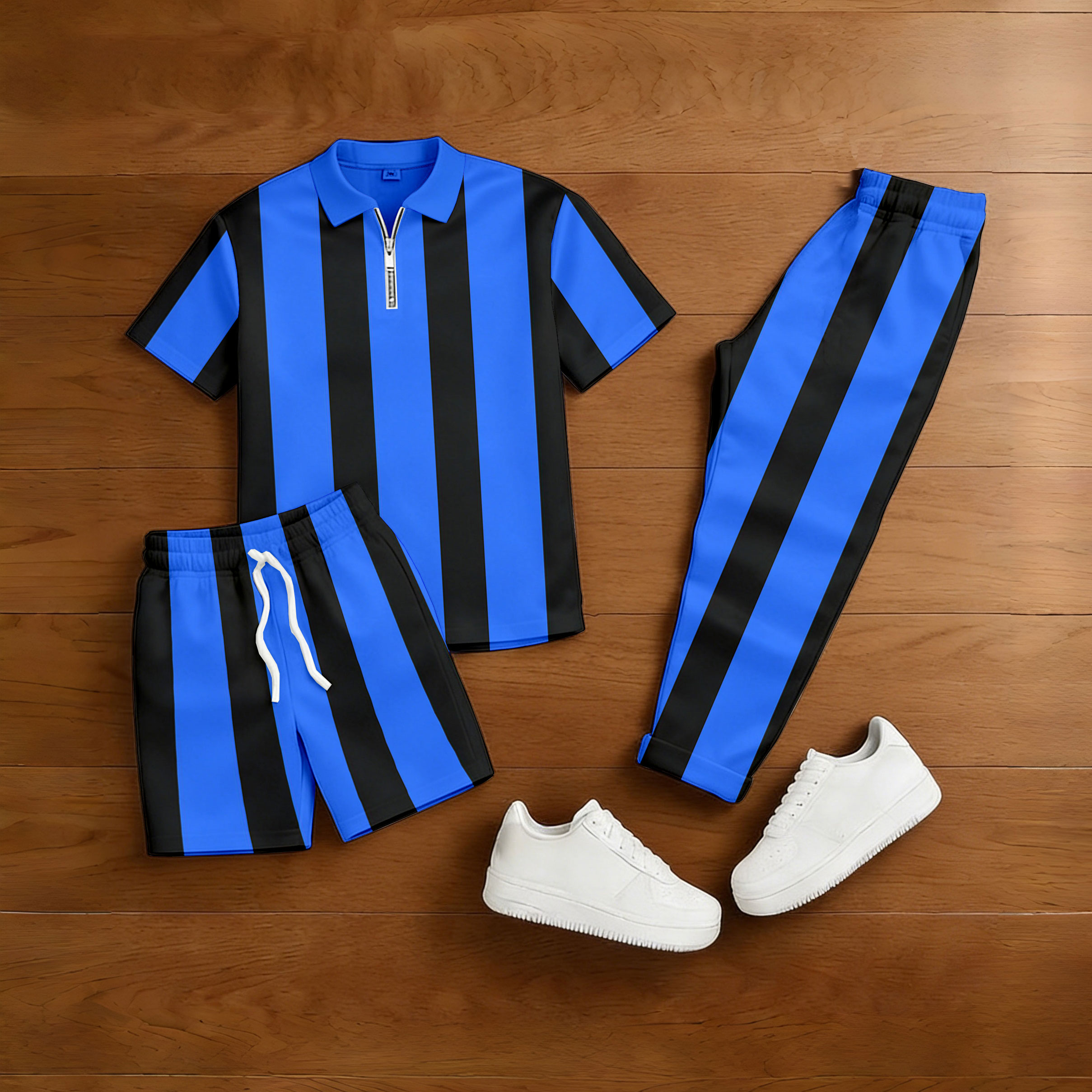Men's Casual Royal Blue & Black Color Matching Striped Printed Zipper Short Sleeved Polo Shirt & Trousers & Shorts 3Pc Set