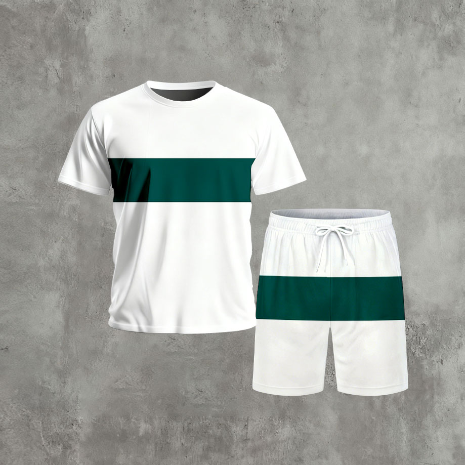 Men's Casual White & Green Color Matching Striped Printed Round Neck Short Sleeved & Shorts Two-Piece Set