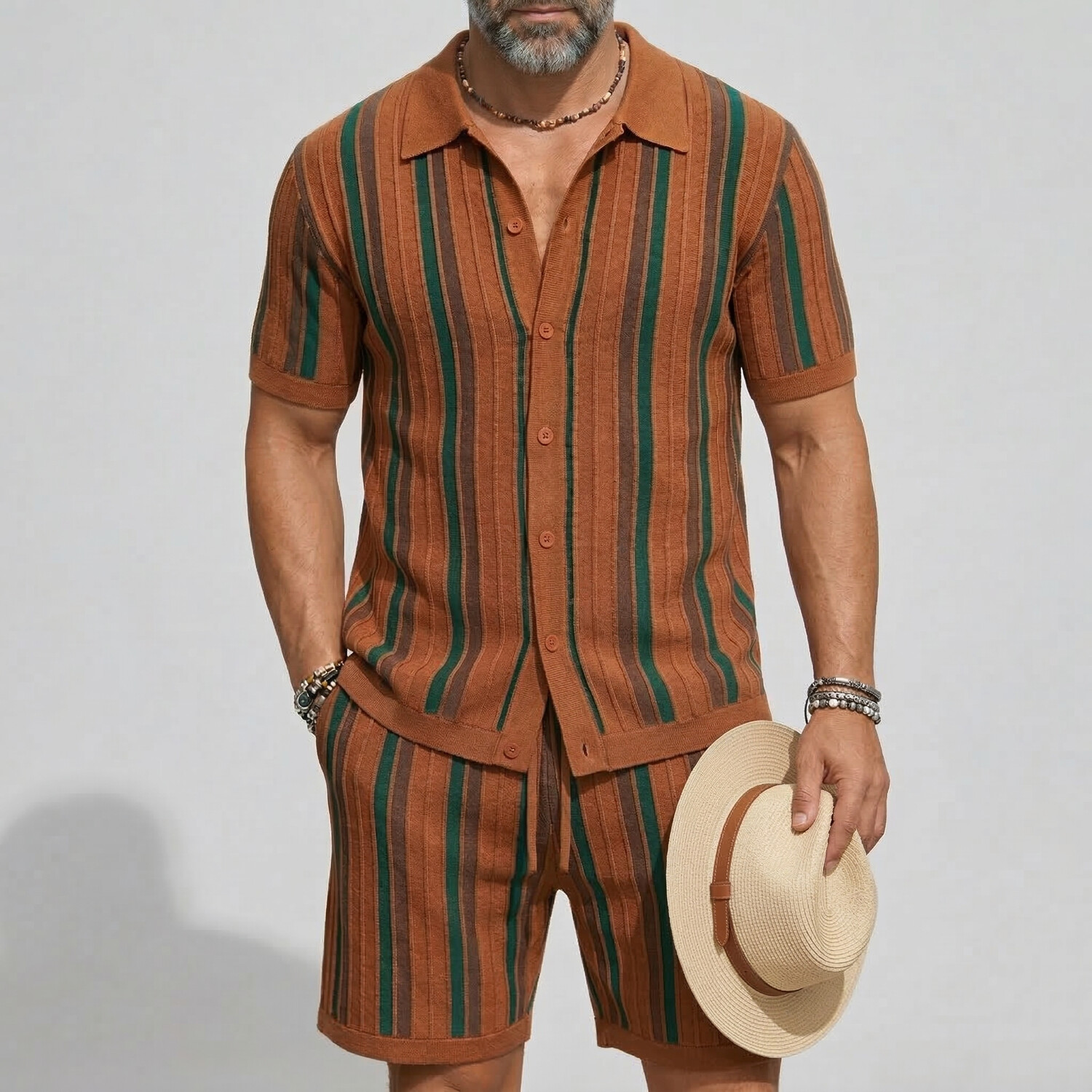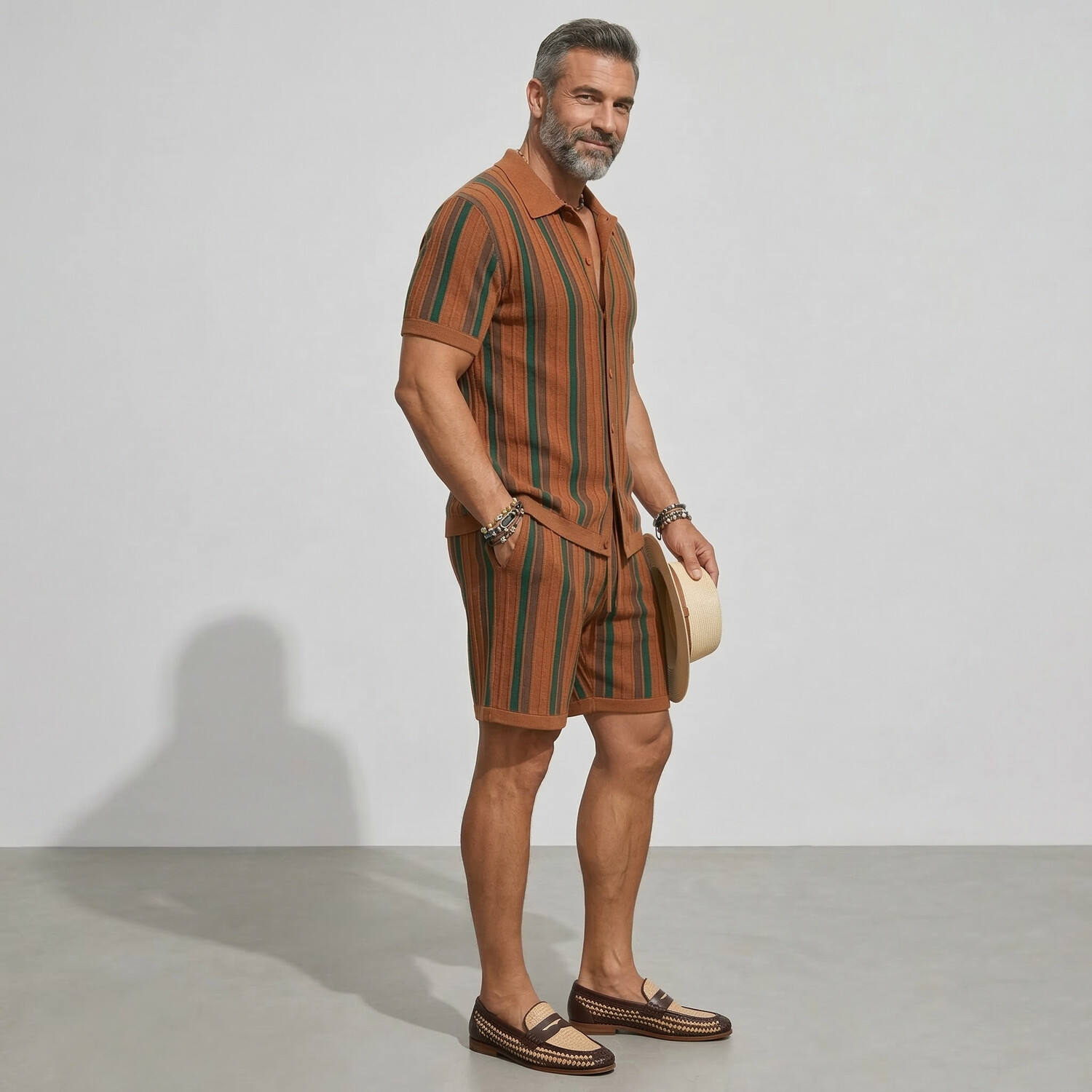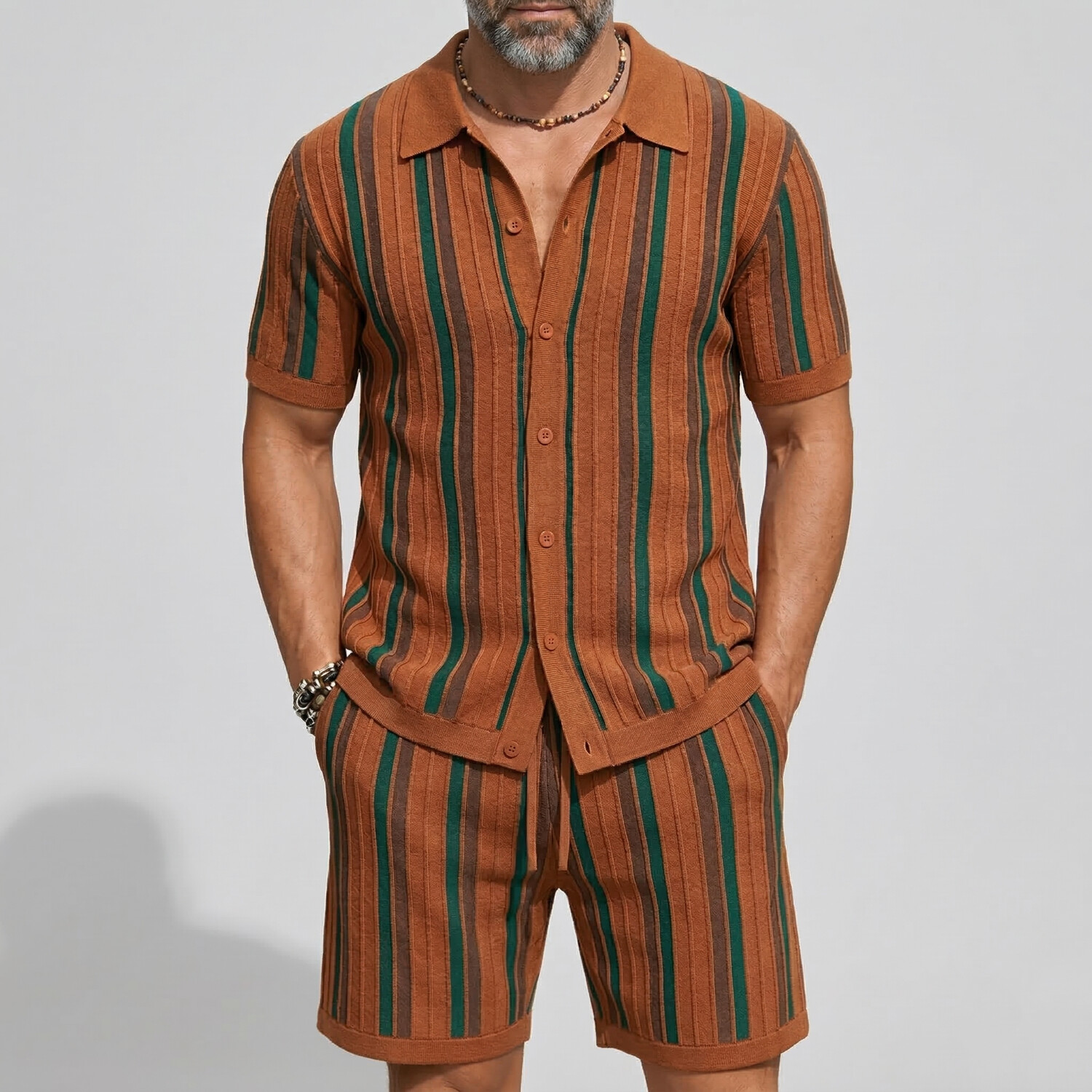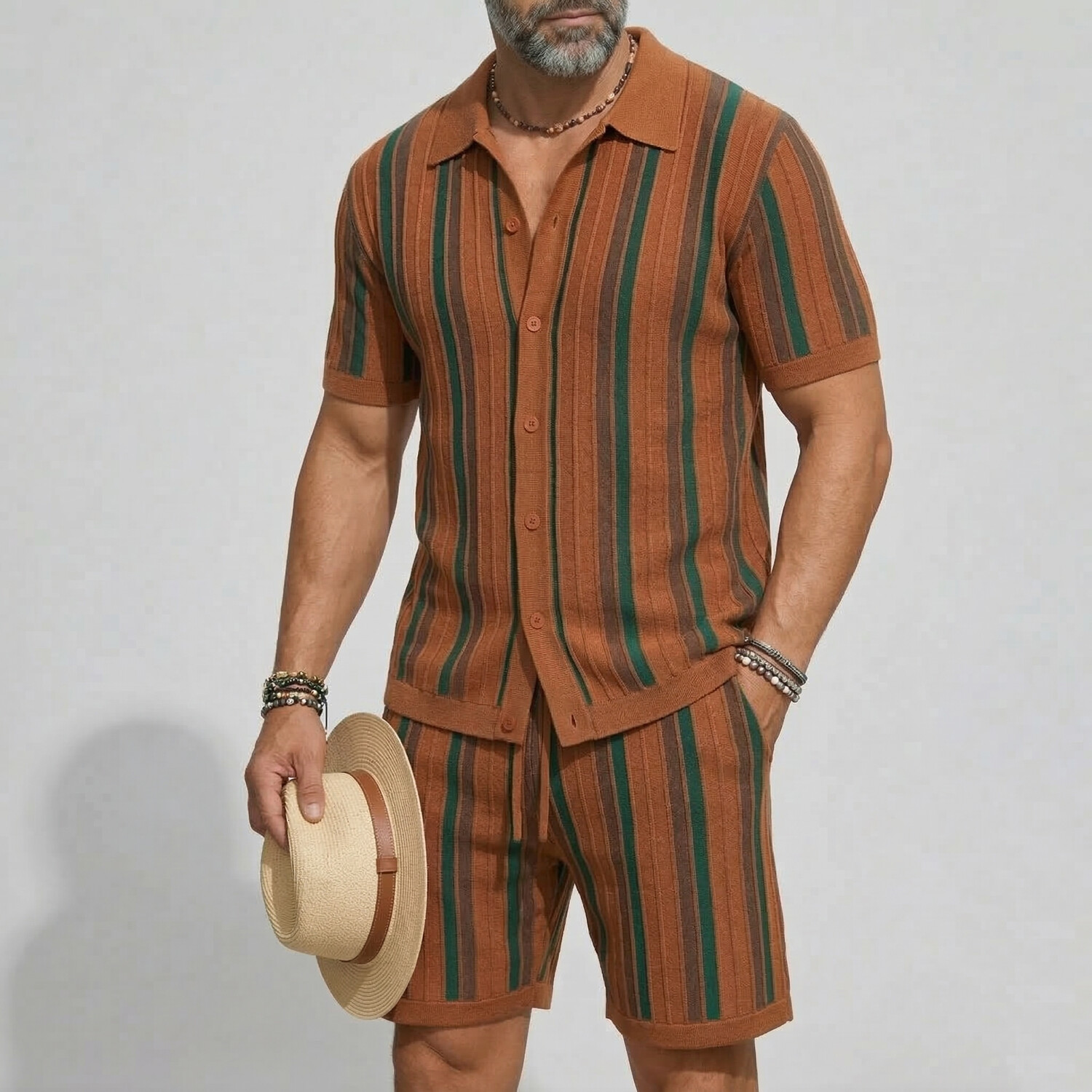Men's Contrast Striped Turndown Collar Short Sleeve Shirt & Drawstring Shorts 2Pcs Set