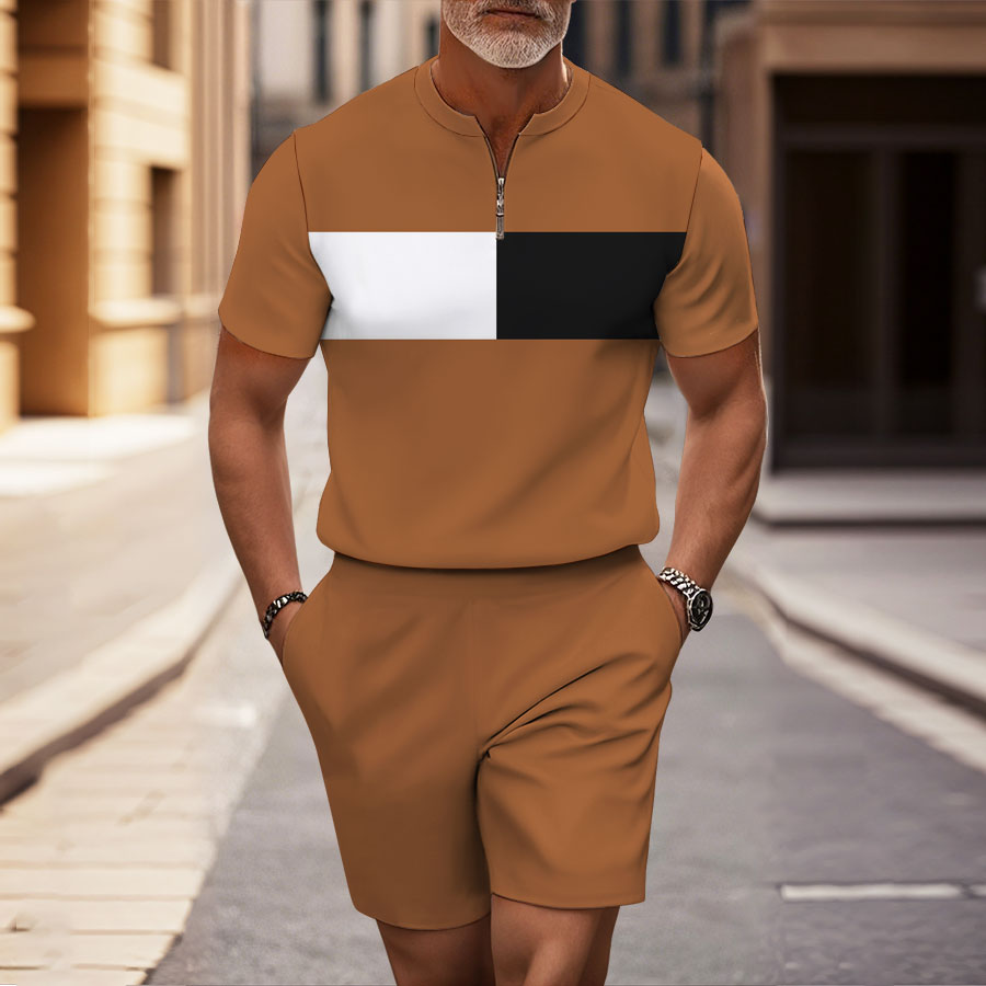 Men's Fashion Casual Brown Color Matching Black & White Striped Printed Round-Neck Zipper Short-Sleeved Two-Piece Set