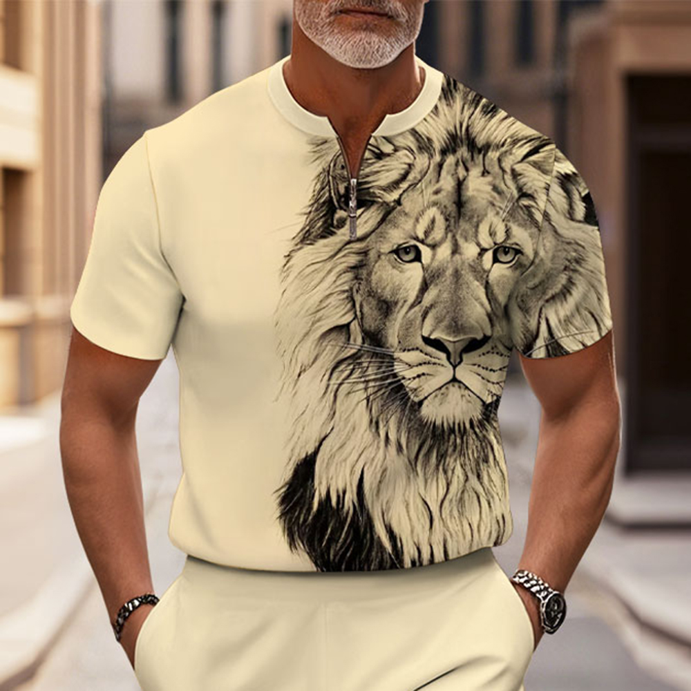 Men's Fashion Casual Apricot & Lion Printed Round-Neck Zipper Short-Sleeved Two-Piece Set