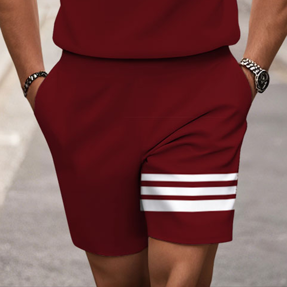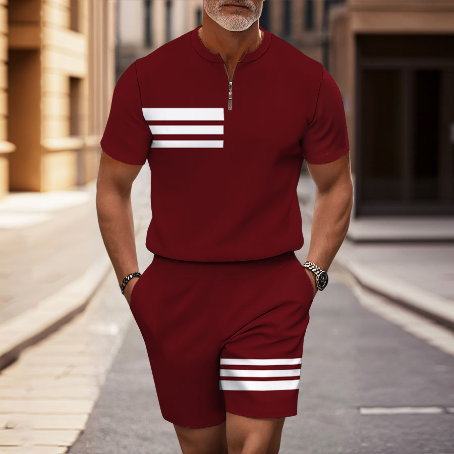 Men's Fashion Casual Maroon & White Color Matching Striped Printed Round-Neck Zipper Short-Sleeved Two-Piece Set