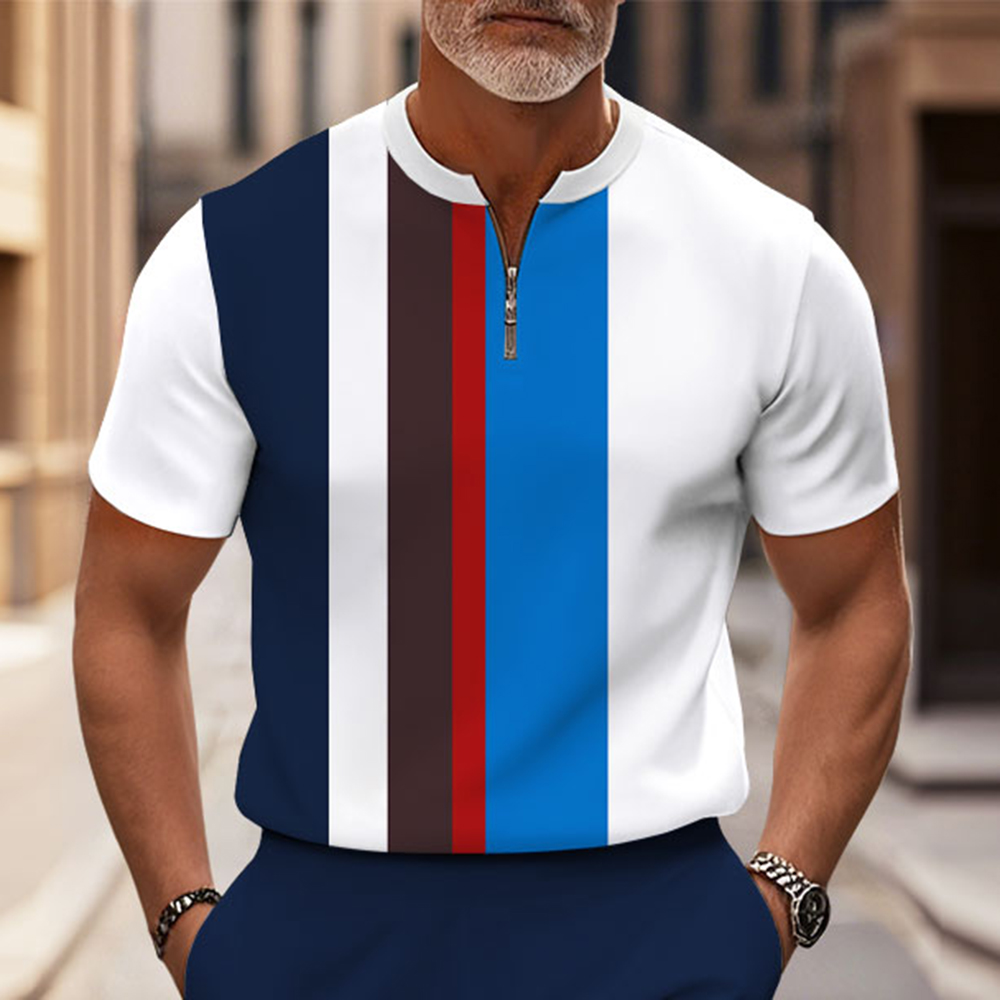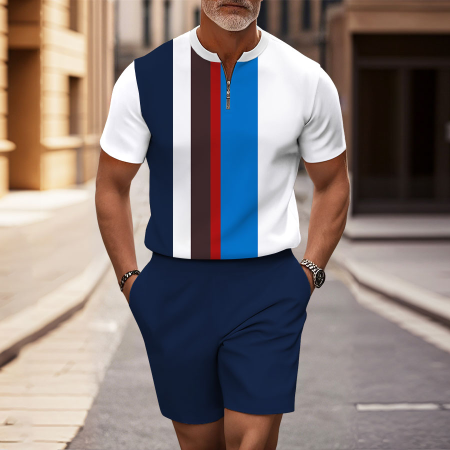 Men's Fashion Casual Multicolored Striped Printed Round-Neck Zipper Short-Sleeved Two-Piece Set