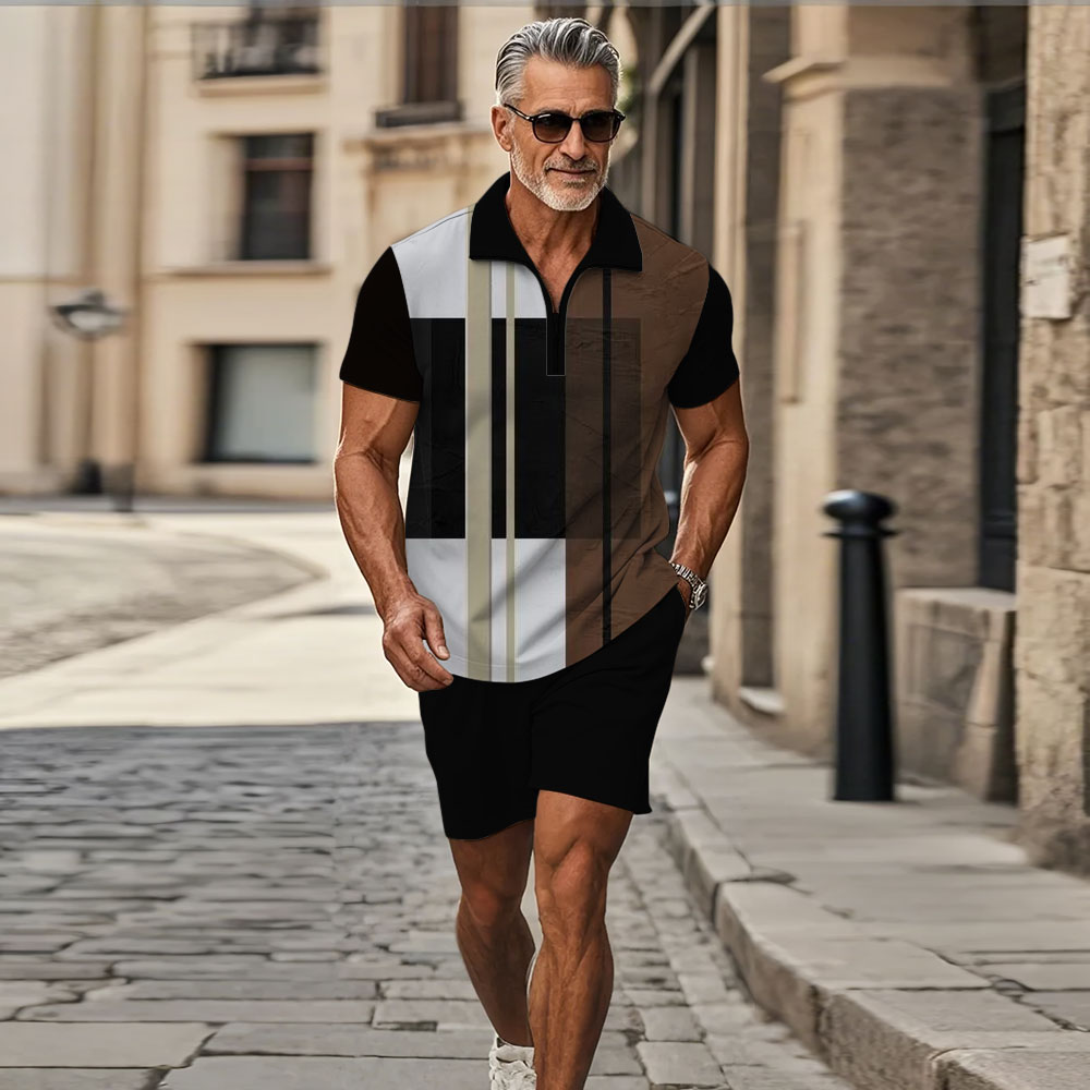Men's Fashion Casual Zipper Polo Collar Geometric Printed Short-Sleeved Two-Piece Set