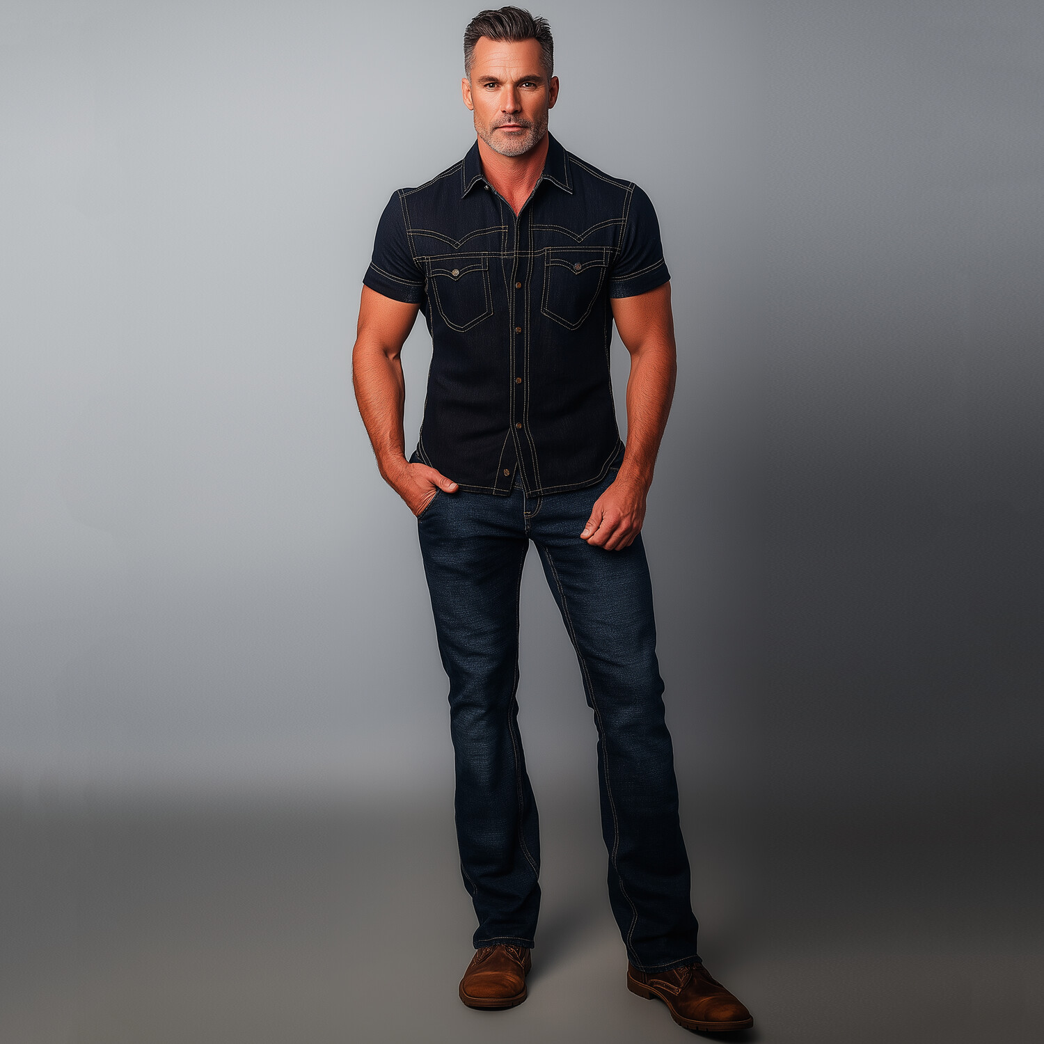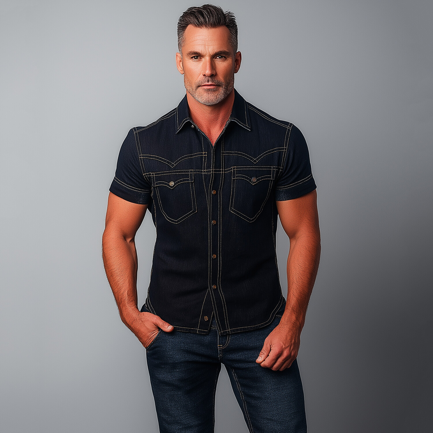 Men's Turndown Collar Short Sleeve Button Contrast Stitch Denim Shirt