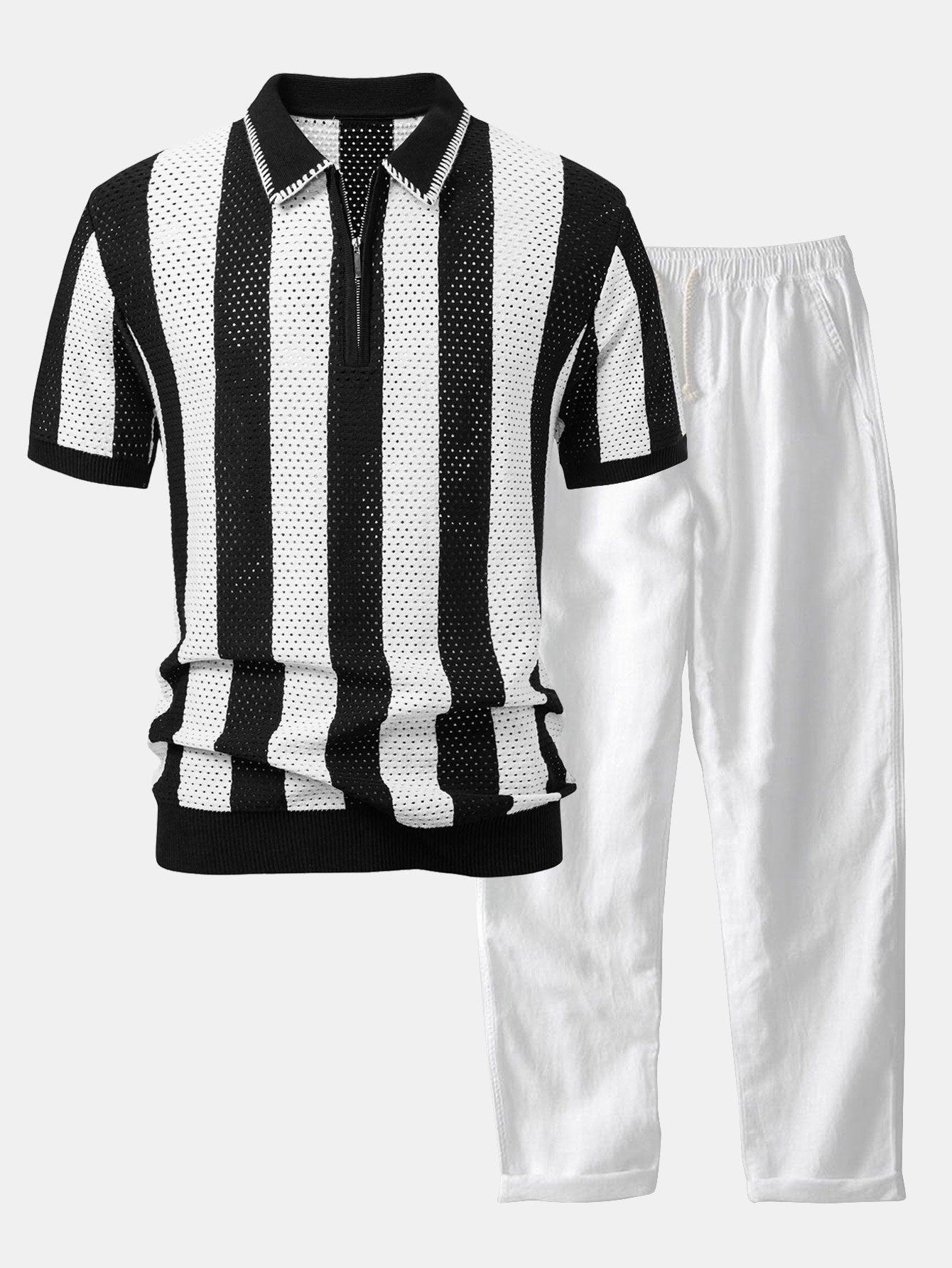 Striped Eyelet Knit Zip Up Polo Shirt & Straight Leg Linen Pants