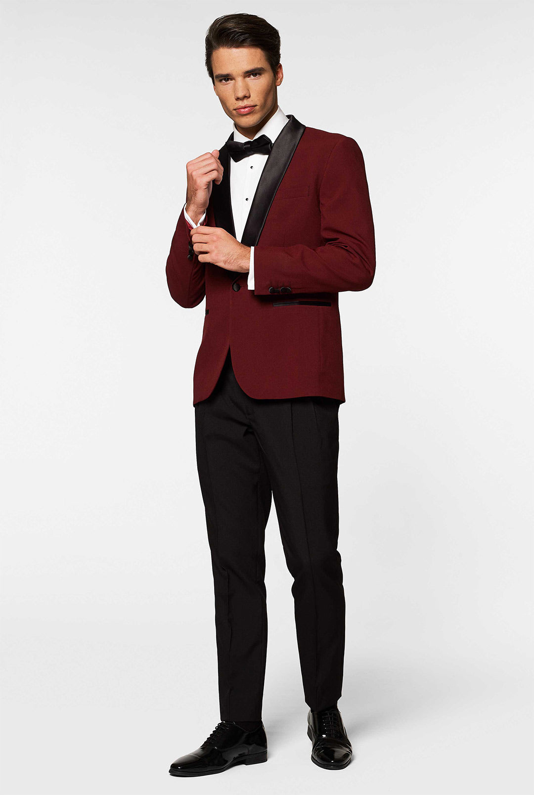 This tuxedo with a burgundy jacket with a satin shawl lapel, black pants with a double pleat and a bow-tie is the perfect outfit for gents who don’t like to play strictly by the rules. It’s not in line with the black-tie dress code, but at the same time undeniably distinguished and stylish, which definitely lets you get away with it. From weddings to formal dinners, this tux is one you'll be wearing and enjoying for numerous special occasions in the years to come.