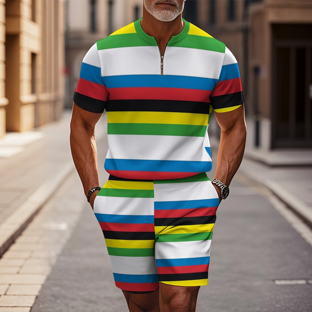 Men's fashion casual round-neck zipper geometric printed short-sleeved two-piece set 2503000039