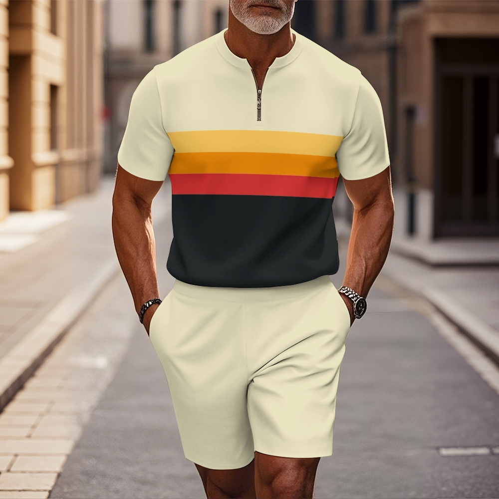 Men's fashion casual round-neck zipper geometric printed short-sleeved two-piece set 2505000485