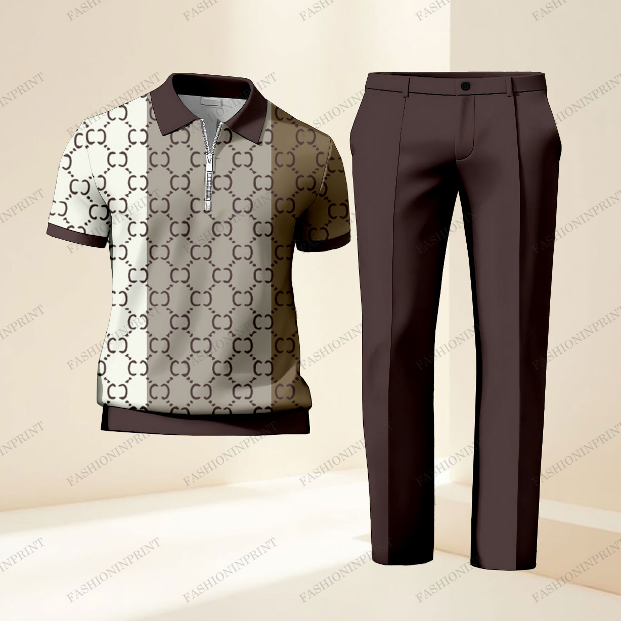 Men's Casual Apricot & Coffee Color Matching Retro Style Printed Short Sleeved Polo Shirt & Trousers Two-Piece Set