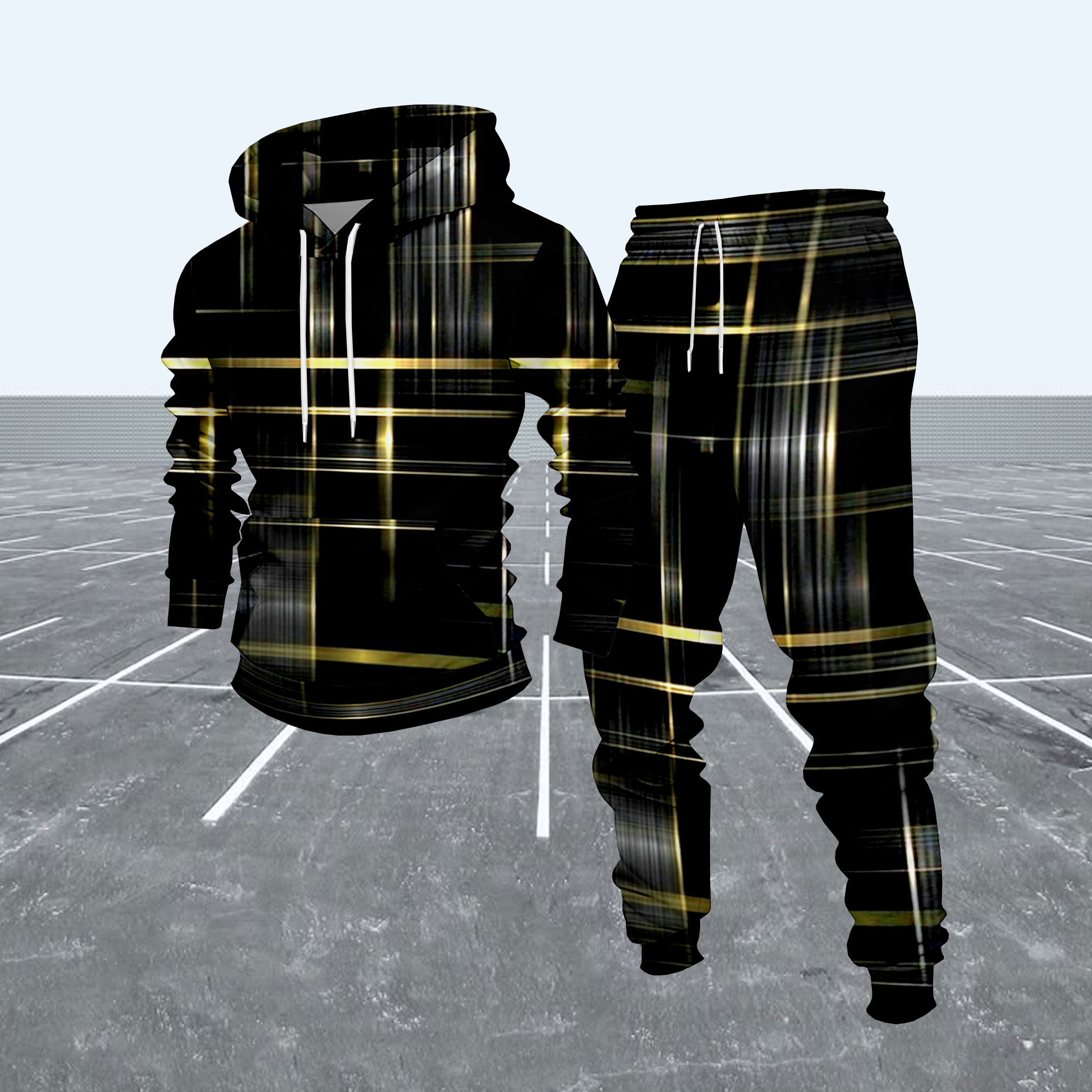 Men's Casual Black & Gold Color Matching Checkered Pattern Hoodies Long Sleeved Sweatshirts & Sweatpants Two-Piece Set